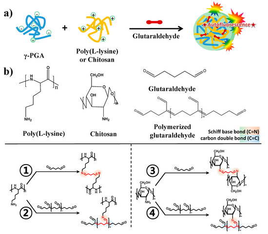 The synthesis of functional polyelectrolyte nanoparticles that provided optical imaging modalities was performed via electrostatic assembly and crosslinking without any fluorescent materials. The self-assembled polyelectrolyte nanoparticles were prepared via electrostatic interactions between the negatively charged carboxyl groups of poly(γ-glutamic acid) (γ-PGA) and the positively charged amino groups of two different polymers: poly-L-lysine (PLL) or chitosan. The crosslinking of amine moieties by glutaraldehyde in the self-assembled nanoparticles imparted higher stability and optical properties to the nanoparticles (Figure 1a). Crosslinking of the amine moiety of cationic polymers with glutaraldehyde provided structural integrity to the nanogels and involved the formation of a autofluorescent chemical bond. Fluorescent Schiff base bonds (C=N) and double bonds (C=C) could be generated simultaneously by crosslinking the cationic polymer with monomeric glutaraldehyde or by polymerizing glutaraldehyde into oligomeric glutaraldehyde followed by a reaction with the cationic polymer, respectively. The chemical structures that result from the Schiff base bonds (C=N) and carbon double bonds (C=C) of the polymerized glutaraldehyde provide autofluorescence properties for biological applications (Figure 1b). As shown in the transmission electron microscopy (TEM) images, the two types of synthesized nanoparticles exhibited a spherical shape (Figure 1c). The mean size of the nanoparticles was approximately 151.3 ± 39.0 nm in the case of γ-PGA/PLL and 167.3 ± 44.6 nm in the case of γ-PGA/chitosan (Figure 1d). The γ-PGA/PLL and γ-PGA/chitosan nanoparticles both possessed strong positive zeta potentials (+34.48 mV and +31.26 mV, respectively) in deionized water (DW).