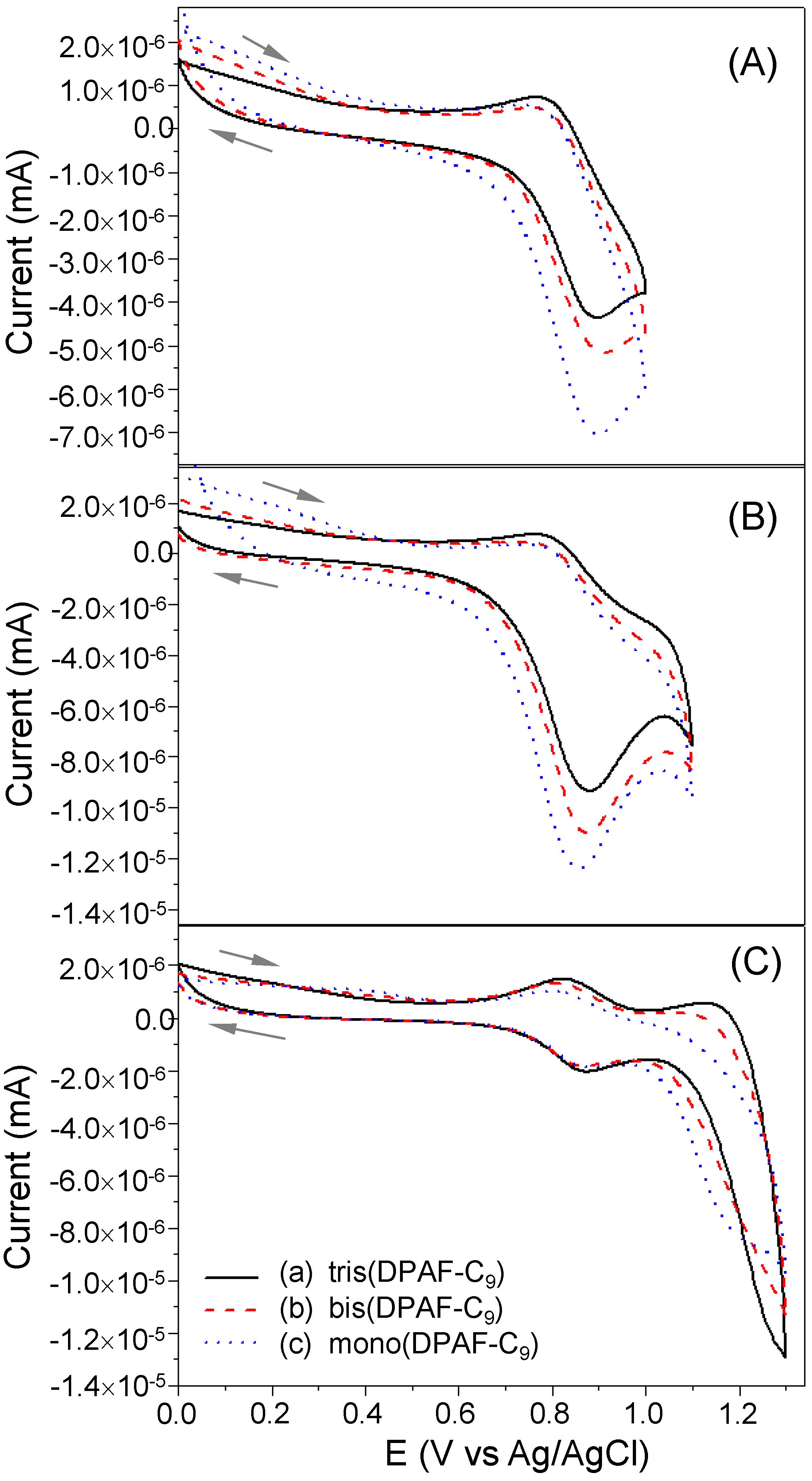 Electrochemical properties of mono-5, bis-6, and tris(DPAF-C9) 7.