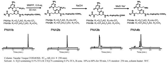 The sulfide-protected PNA1 was smoothly converted to PNA2 by oxidation with magnesium monoperoxyphthalate (MMPP), followed by treatment with an aqueous NaOH solution to generate the vinyl group of PNA3, as shown in Figure 3.