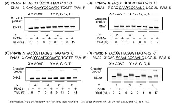 Evaluation of the crosslink reactivity of PNA3 to DNA and RNA. (A) PNA3a and target DNA1; (B) PNA3a and target RNA1; (C) PNA3b and target DNA2; (D) PNA3b and target RNA2.