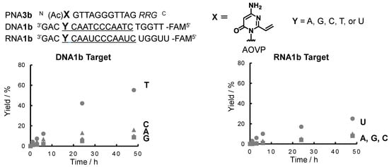 The time course of the crosslink yields for DNA2 and RNA2 with PNA3b is summarized in Figure 5. PNA3b exhibited the highest yield to thymine compared to the other target bases in DNA. In contrast, lower yields with any of the target bases in RNA were observed, although the selectivity was retained to some extent during the reaction with uridine. The crosslink reactions with DNA and RNA with PNA3b were accelerated at 50 °C (Figure S6). The DNA oligonucleotide with the same sequence containing the AOVP derivative (1) did not form the duplex at 50 °C, resulting in no crosslink formation with the target DNA or RNA at this temperature. In our previous report, the AOVP derivative (1) at the middle position in DNA exhibited high reactivity and selectivity to thymine in DNA (~70% after 2 h) and to uridine in RNA (~80% after 2 h) [22]. The PNA CONTAINING AOVP showed lower yields than that of the DNA derivative.