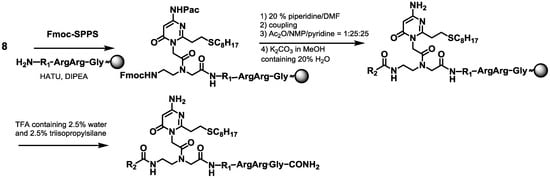 3.2.5. Synthesis of N-[2-(N-9-Fluorenylmethoxycarbonyl)aminoethyl]-N-[[4-phenoxyacetyl-amino-6-oxo-2-(2-octylthioethyl)pyrimidin-1-yl]acetyl]glycine (8)