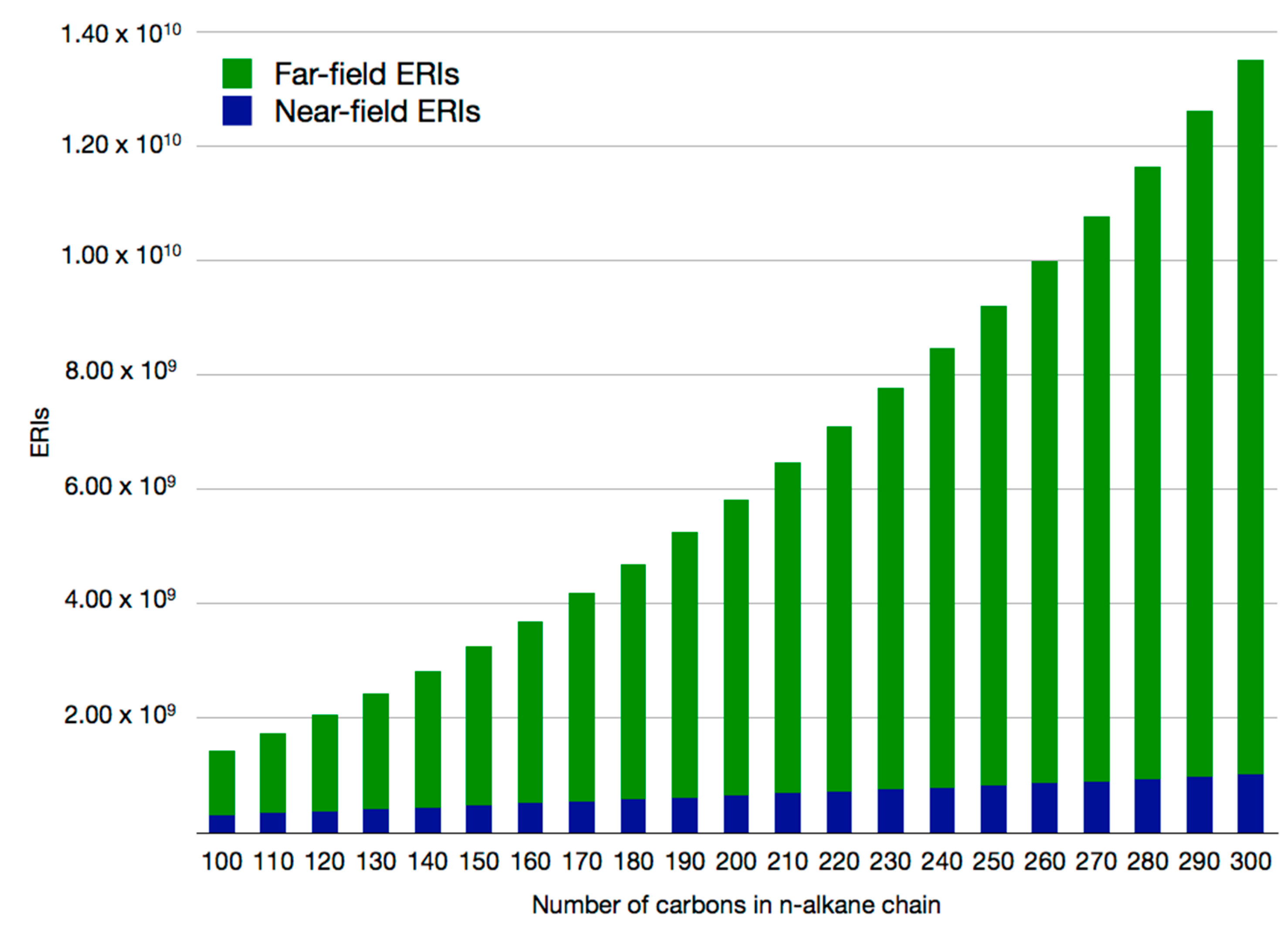 For typical QM/MM calculations with large MM regions, the number of near-field NAIs that must be calculated by integral recurrence relations [20] is much smaller than the number of far-field NAIs. These far-field NAIs can be expressed to any desired accuracy by asymptotic integral expansions [17] of the form: