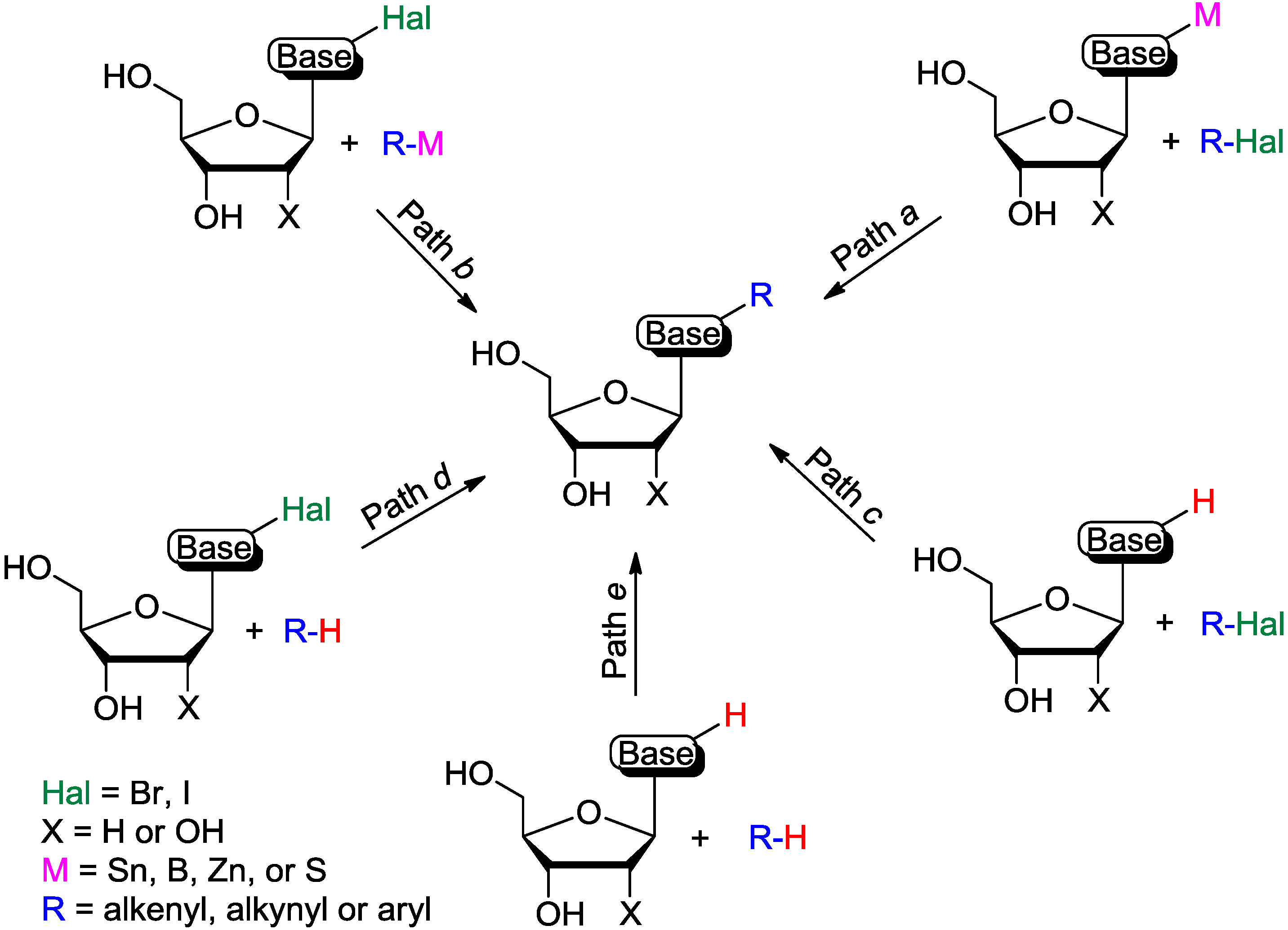 Transition metal-catalyzed approaches towards the synthesis of base-modified nucleosides can be divided into five major categories as depicted in Figure 1. The first two approaches are based on cross-couplings between two activated components. One involves reactions between metal-activated nucleoside bases and halides (Figure 1, Path a) while the second employs couplings between halo (or triflate) modified nucleoside bases and organometallics (Path b). These approaches were extensively reviewed [10,11,12] and are not discussed in this account. The next two approaches are based on cross-couplings between only one activated component and require C-H activation at the second substrate. One involves reactions between C-H activated bond in nucleoside bases and halides (Path c), while the second employs couplings between halo-modified nucleoside bases and arenes, which, in turn, require selective C-H activation (Path d). The last approach involves cross-couplings between two inactivated substrates [cross-dehydrogenative coupling (CDC) reactions; Path e]. Direct C-H functionalization approaches (Paths c-e) alleviate some drawbacks associated with the synthesis of modified nucleosides employed in traditional Pd-catalyzed cross-coupling reactions (Paths a-b). They also avoid usage of the toxic organotin components, which are problematic during biological studies, or the sometimes unstable organoboronic substrates.