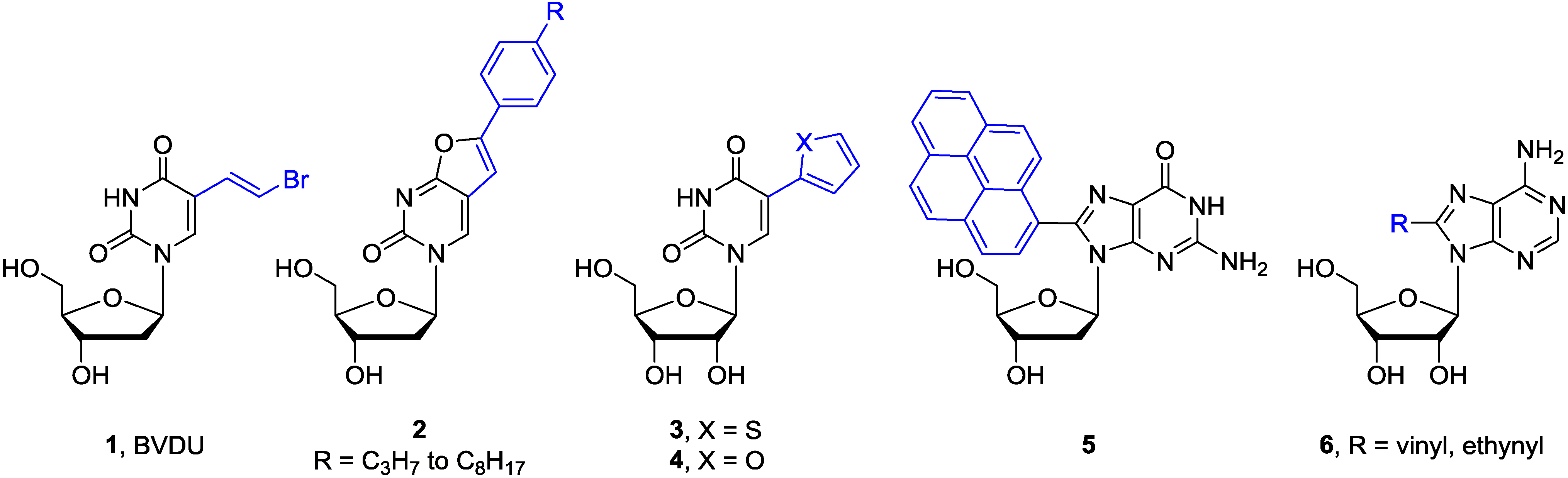 Numerous C5 or C6 modified pyrimidine nucleosides and C2 or C8 modified purine nucleosides have been synthesized in last 40 years employing the transition-metal assisted cross-coupling reactions [10]. Some of them show potent biological activity and/or are utilized as mechanistic or labelling probes (Figure 2). For example, the (E)-5-(2-bromovinyl)-2′-deoxyuridine (1, BVDU) has been found to be a highly potent and selective anti-herpes agent [13]. The bicyclic furanopyrimidine-2-one nucleoside analogues bearing an aryl side chain 2 display remarkable antiviral potency against the Varicella-Zoster virus [14]. The 5-thienyl- 3 or 5-furyluridine 4 were used as molecular beacons for oligonucleotide labeling [15,16,17,18]. The 8-pyrenyl-2'-deoxyguanosine 5 serves as a probe for the spectroscopic study of the reductive electron transfer through DNA [19,20]. Furthermore, the 8-vinyl and 8-ethynyladenosines 6 show cytotoxic activity against tumor cell lines [21], while oligodeoxynucleotides modified with the 8-alkynyl-dG possess thrombin inhibitory activity [22].