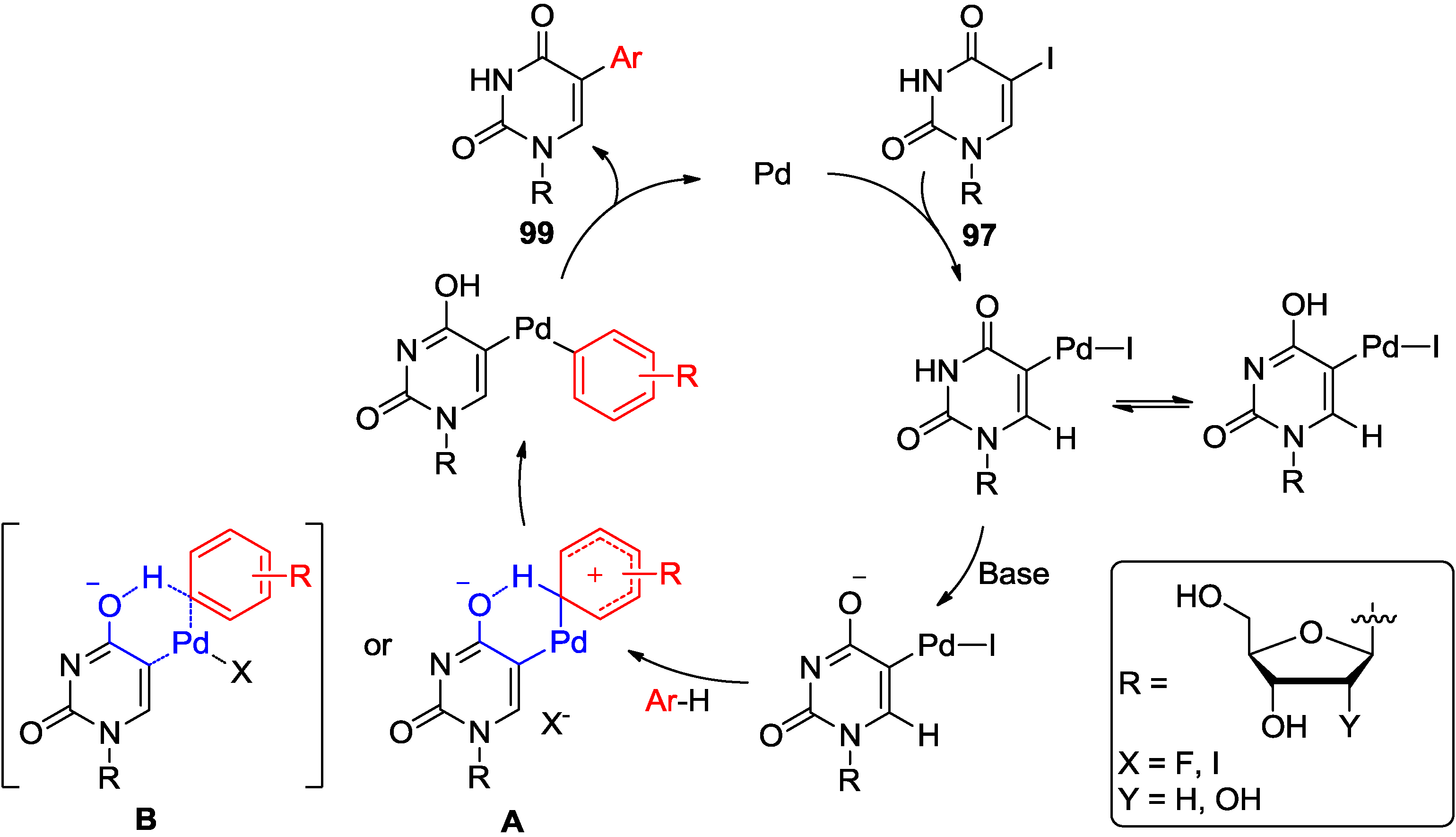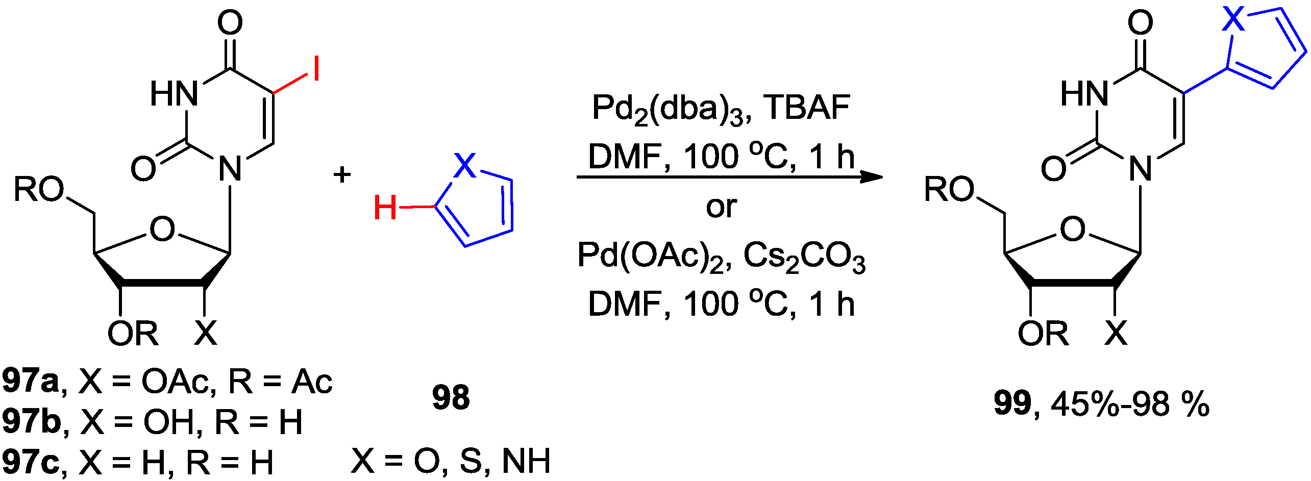 This TBAF-promoted protocol, which proceeded without the necessity of adding ligands and/or additives, worked efficiently with the natural uracils and uracil nucleosides, and was compatible with the stability of the glycosylic bond for 2'-deoxyuridine substrates (e.g., 97c). The 5-(2-furyl, or 2-thienyl, or 2-pyrrolyl)uridine derivatives 99, that are important RNA and DNA fluorescent probes [15,16,17,18], were synthesized in up to 98% yields without the necessity of using organometallic substrates. The arylation proceeded also when TBAF was replaced with Cs2CO3 base with or without the presence of PivOH [80]. The analogous coupling of 5-iodocytidines with arenes failed to afford 5-arylated products.