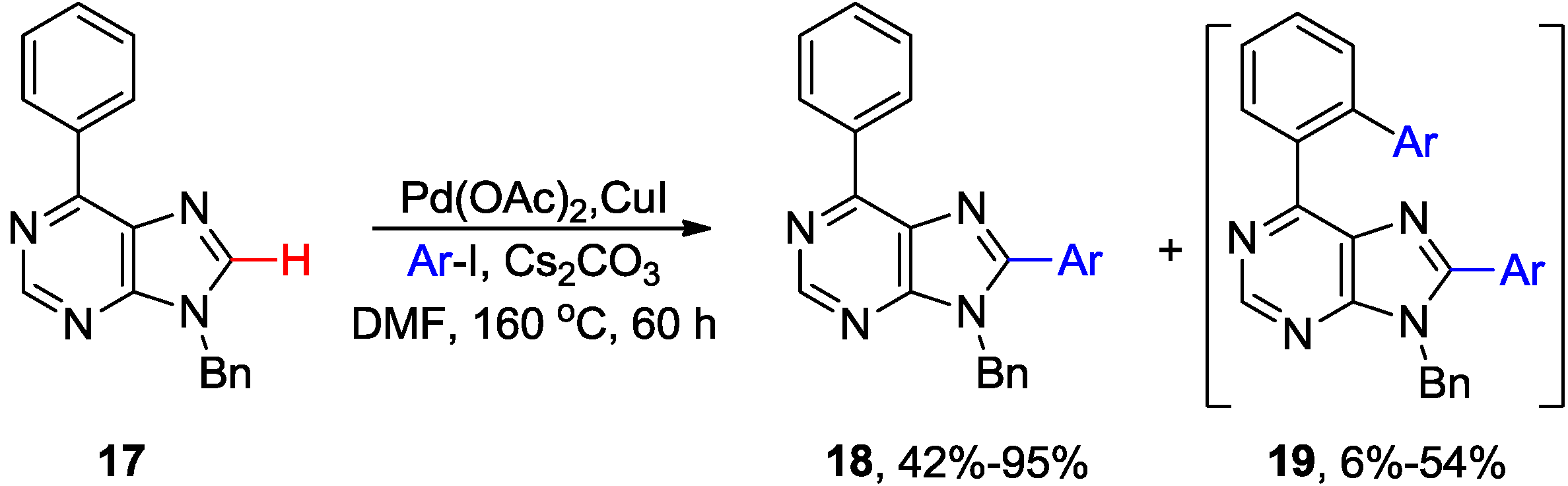 These Pd-catalyzed/Cu-mediated methodologies were successfully applied to the synthesis of numerous 8-arylated purines and adenines. In 2006, Hocek and coworkers elaborated the original protocol for the efficient direct C8-H arylation of 6-phenylpurine analogues 17 using aryl iodides in the presence of Cs2CO3 and CuI to give 18 (Scheme 4) [24]. This route required prolonged heating at high temperature (160 °C/60 h) in DMF. Furthermore, it was essential to perform the coupling with strict exclusion of air to avoid formation of two byproducts, sometimes, in substantial yields (6%–54%). One byproduct was 19, which was formed by double arylation at C8 position and the ortho position of the phenyl ring at C6. The other byproduct was the 8,8'-bispurine dimer. Various 6,8,9-trisubstituted and 2,6,8,9-tetrasubstituted purine analogues were synthesized using this approach in combination with Suzuki cross-coupling reaction and Cu-catalyzed N-arylation at 9 position [24,25]. These conditions (Cs2CO3 or piperidine) were successfully employed for the synthesis of 8,9-disubstituted adenines but 6-N-(di)arylated byproducts were observed [24,25]. This protocol was also applied for direct C8-H arylation of adenines anchored to solid phase via 6-N amino group (in the presence of piperidine as base) [31].