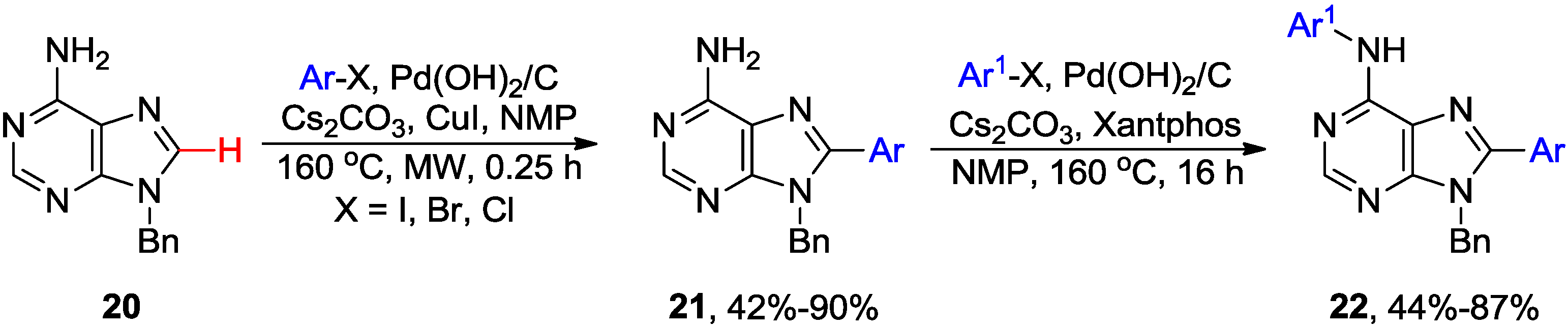 Alami and coworkers developed a microwave-assisted direct C8 arylation of free-(NH2) 9-N-protected adenine 20 with aryl halides catalyzed by Pd(OH)2/C (Pearlman's catalyst) in the presence of CuI (Scheme 5) [32]. Reaction took only 15 min at 160 °C in NMP solvent when Cs2CO3 was used as base to give 21 in up to 90% yield. The application of Pd(OH)2/C catalyst allowed coupling with aryl bromides and even less reactive aryl chlorides [33]. Sequential combination of C8-arylation with ArCl and 6-N-arylation with ArBr or ArI (using Xantphos [34] instead of CuI) provides access to disubstituted adenines 22 [33].