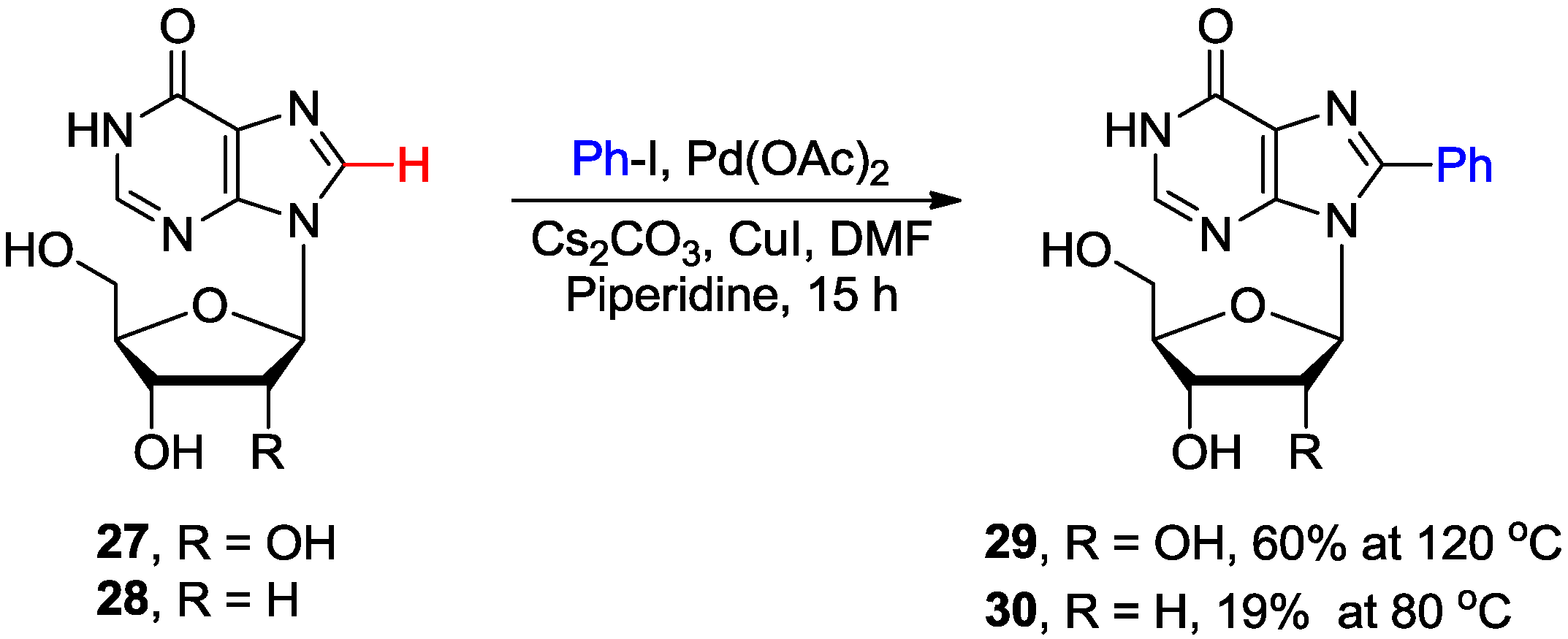 The Pd-catalyzed/Cu-mediated direct C8-H arylation of inosine 27 proceeded proficiently to afford 8-phenylated product 29 in good yield (60%) at 120 °C (Scheme 8) [26]. The analogous functionalization of 2'-deoxyinosine 28, due to the stability of the glycosylic bond, had to be carried out at lower temperature to give product 30 but in only 19% yield.