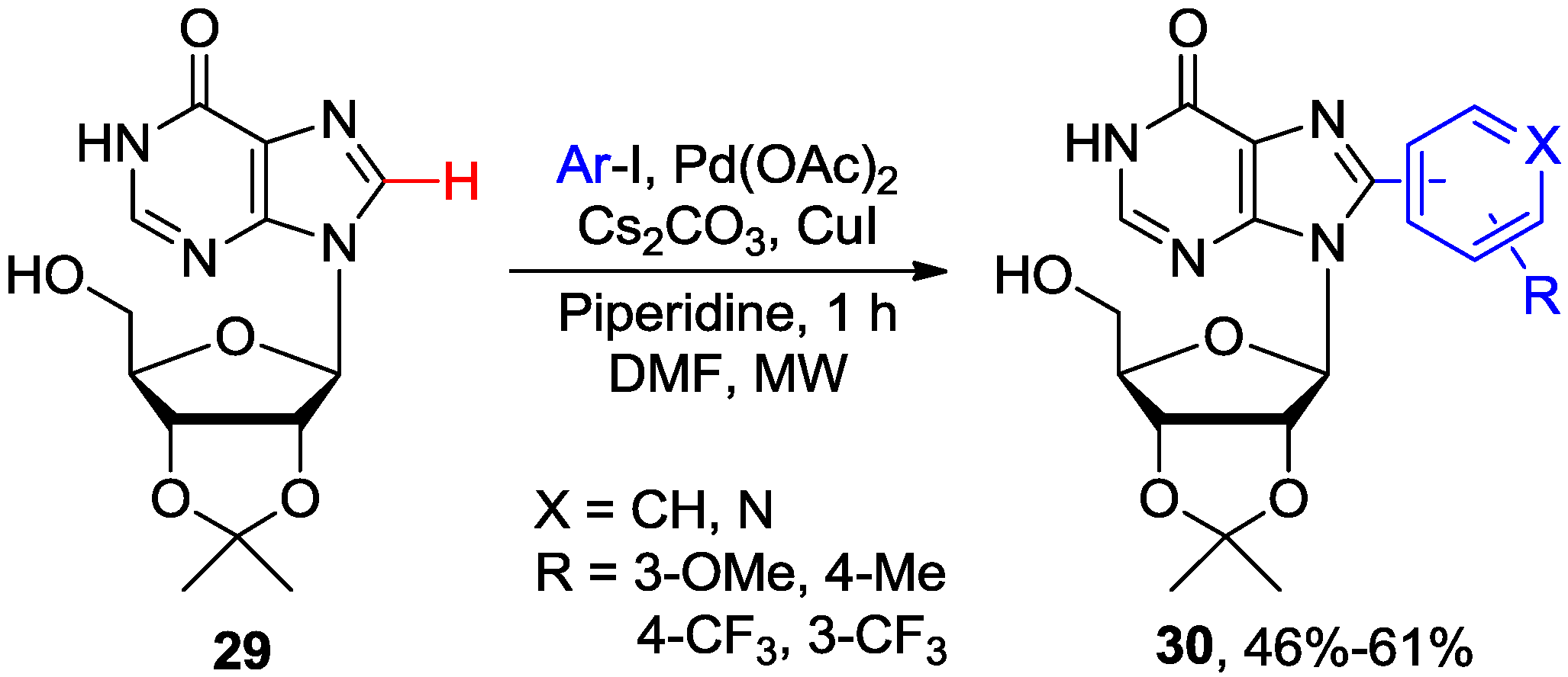 Microwave-assisted direct C8-H arylation of inosine 29 with aryl iodides.