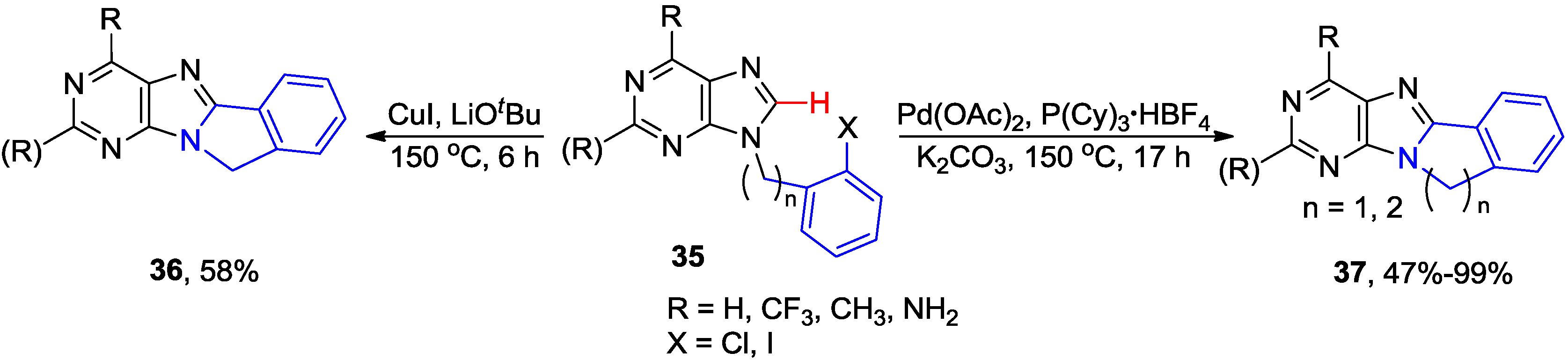 The purines 37 with five or six-membered e-fused rings were also synthesized by intramolecular cyclizations of 9-(2-chlorophenylalkyl)purines 35 (n = 1 or 2; X = Cl) employing conditions developed by Fagnou [39] for direct arylation with aryl halides [Pd(OAc)2/tricyclohexylphoshine/K2CO3 in DMF] (Scheme 11) [38,40]. Domínguez and coworks reported the synthesis of five-membered ring analogue 36 by Cu-catalyzed direct C8-H arylation of 9-(2-iodophenylmethyl)purines 35 (n = 1, X = I) in 58% yield [41].