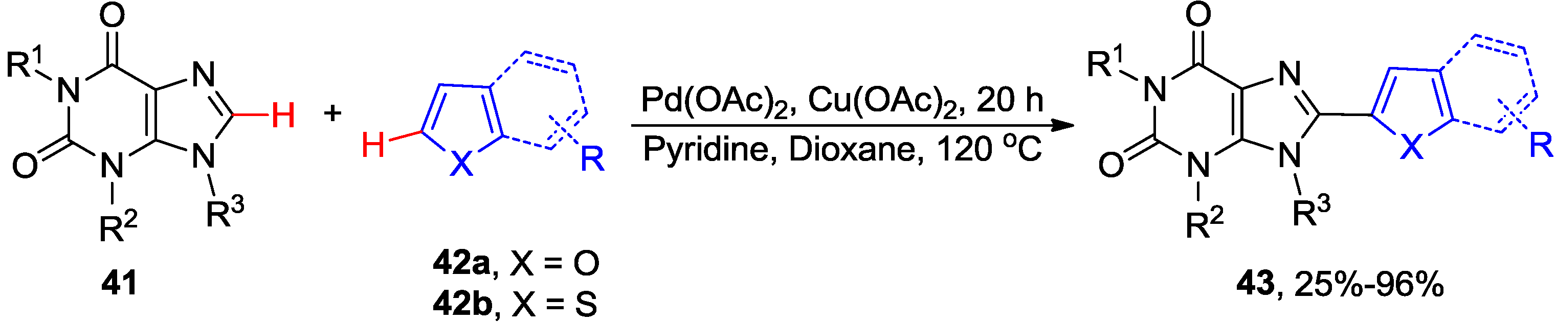 You and co-workers reported intermolecular Pd/Cu-catalyzed regioselective C8-H cross-coupling of 1,3-diethyl xanthine 41 (R1 = R2 = Et, R3 = H) with electron-rich furans 42a and thiophenes 42b [43]. For example coupling of 41 with 2-methylthiophene in the presence of catalytic amount of the copper salt gave diheteroarene product of type 43 in 96%, indicating the tolerance of the free NH group at the 9 position to the reaction conditions (Scheme 13). The differences in the electron density of two heteroarene components was believed to facilitate the reactivity and selectivity in the two metalation steps [44] of the catalytic cycle of this cross-dehydrogenative arylation reaction.