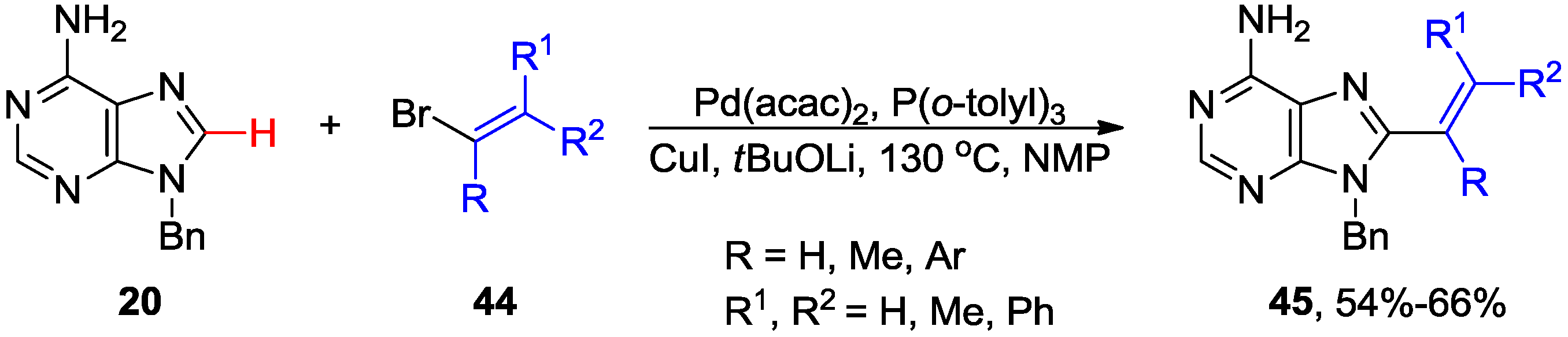 The 8-alkenyl adenine analogues 45 have been synthesized via microwave-assisted direct C8-H alkenylation of 9-N-benzyladenines 20 with alkenyl bromides 44 (Scheme 14) [32]. Analogous Pd/Cu-mediated C8 alkenylations of 6-(benzylthio)-9-N-benzylpurines with styryl bromides provided access to 6,8,9-trisubstituted purines [45]. The optimized conditions (Pd/CuI/tBuOLi) were applicable for the selective alkenylation of caffeine, benzimidazole and other aromatic azole heterocycles [45,46]. These are significant developments since it was reported that 8-bromoadenosine was not a good substrate for Mizoroki-Heck reaction [47] making modification at 8 position via direct functionalization of C8-H bond a desirable transformation.