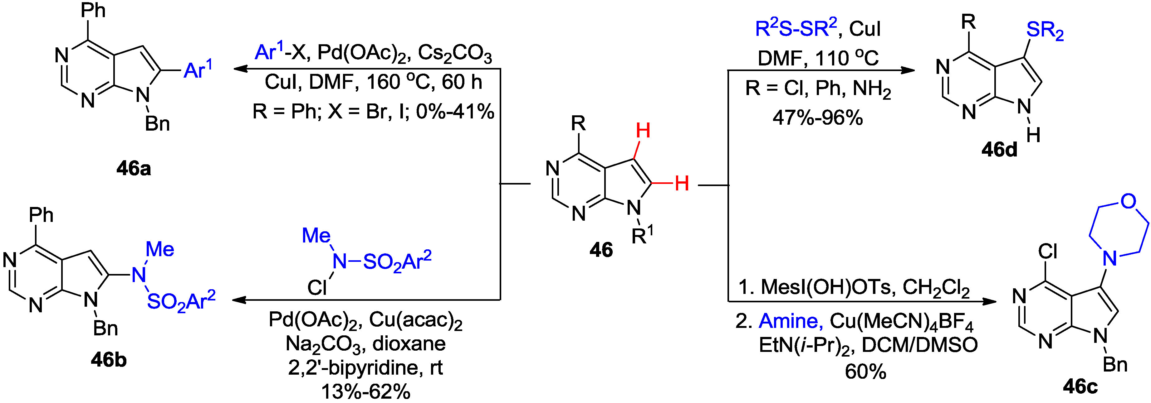 Modification of biologically important 7-deazapurines by direct C-H activation have also been explored (Scheme 15). Thus, regioselective Pd-catalyzed direct C8-H arylation of the 6-phenyl-7-deazapurine analogue 46 (R1 = Bn) with aryl halides gave corresponding 8-arylated products 46a albeit in low to moderate yields (0%–41%) [48]. Alternatively, Ir-catalyzed C-H borylation of 46 (R = Ph, R1 = Bn) followed by Suzuki coupling with aryl halides afforded 46a in high yields (79%–95%). Interestingly, Ir-catalyzed C-H borylation was not successful with purines suggesting that the complexation of Ir catalyst to N7 nitrogen might be responsible for the lack of reactivity [48]. The regioselective Pd/Cu-catalyzed direct C8-H amination of the 6-phenyl-7-deazapurine analogue 46 (R1 = Bn) with N-chloro-N-sulfonamides provided the 8-amino-7-deazapurine analogues 46b [49]. However, subjection of the 6-chloro-7-deazapurine 46 (R1 = Bn) to the similar coupling conditions produced a complex mixture. Remarkably, application of conditions, developed by Suna and co-workers for direct C5-H amination of uracils (see Scheme 33), to the same substrate 46 (R = Cl, R1 = Bn) provided 7-amino-7-deazapurine analogue 46c in 60% [50]. Cu-catalyzed direct C-H sulfenylation of 6-substituted-7-deazapurines 46 (R1 = H) with aryl or alkyl disulfides provided 7-aryl(or alkyl)sulfanyl products 46d (47%–96%) in addition to minor quantities of 7,8-bis(sulfanyl) byproducts [51].