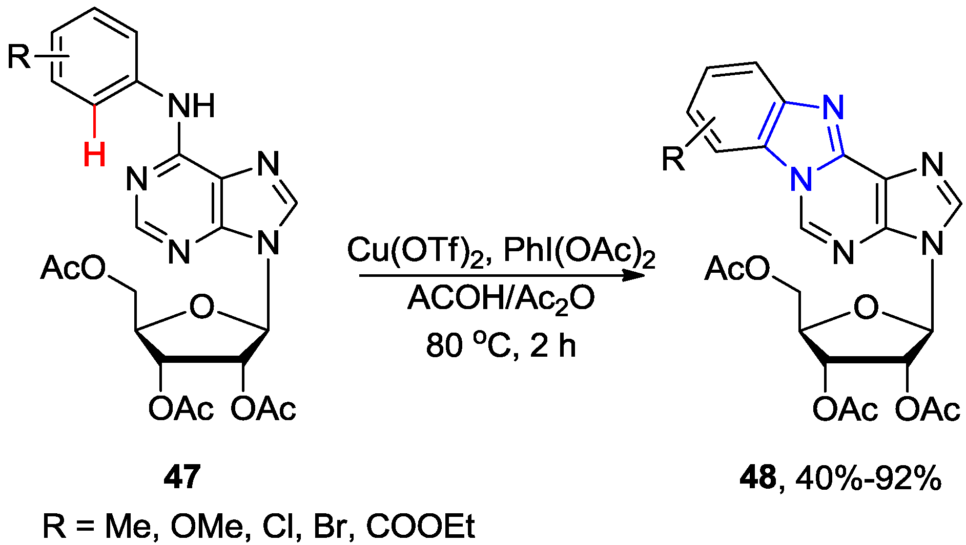 The Cu-catalyzed direct C-H activation/intramolecular amination reaction of the 2',3',5'-tri-O-acetyl-6-N-aryladenosines 47 were employed for the synthesis of fluorescent polycyclic purine and purine nucleosides of type 48 (Scheme 16) [52]. It was found that addition of Ac2O significantly improved the reaction rate (2 h at 80 °C) when Cu(OTf)2 (5 mol %) was used as copper source and PhI(OAc)2 was used as the oxidant. The 6-N-aryladenosines substrates 47 containing electron-withdrawing groups in the benzene ring gave better yields (~85%–92%) than those bearing electron donating groups (~45%–62%). The proposed catalytic cycle involves initial coordination of Cu(OTf)2 to the 6-NH····N1 tautomer of substrate 47 at N1 position followed by electrophilic substitution yielding Cu(II) intermediate bridging N1 position of the purine ring and ortho position in the aryl ring. Subsequent reductive elimination then provides the fused product 48.