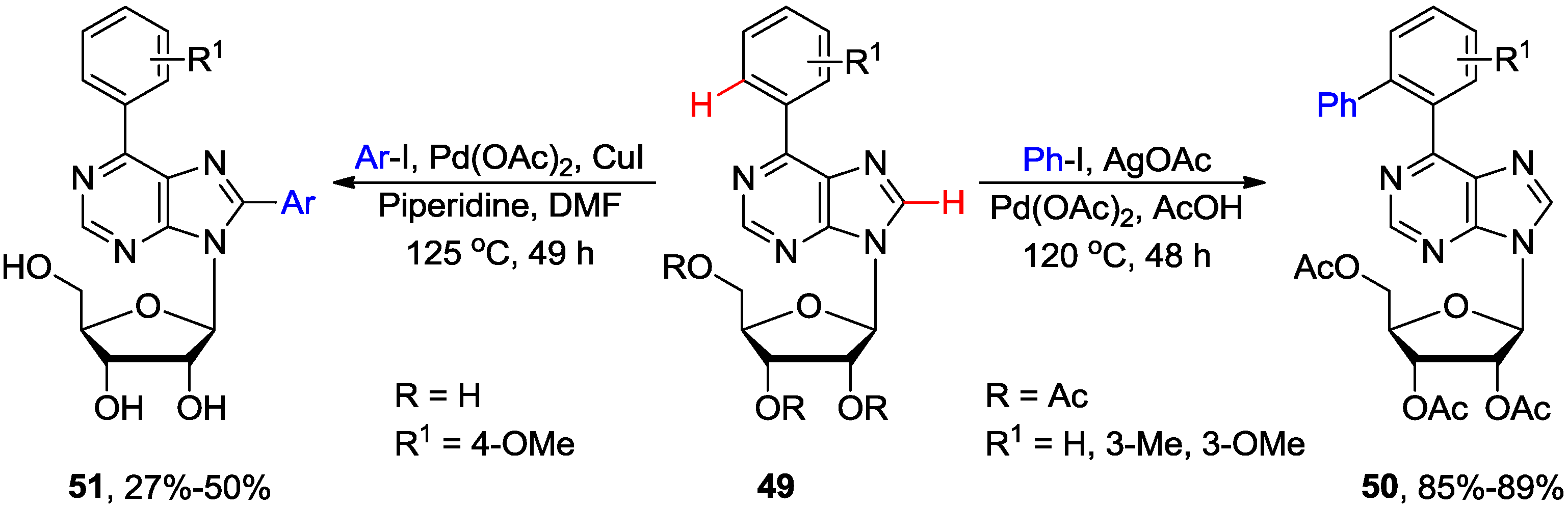Qu and coworkers developed a Pd-catalyzed strategy for the regioselective ortho monophenylation of 6-arylpurine nucleosides (e.g., 49) via (N1 purine nitrogen atom)-directed C−H activation using a large excess (30 equiv.) of iodobenzene (Scheme 17) [53]. It was essential to perform the reaction under an inert N2 atmosphere at 120 °C in the presence of AcOH in order to synthesize 50 in excellent yield (85%). It was believed that AcOH might help (i) to overcome the poisoning of the catalyst attributed to the multiple nitrogens present in purine ring, and (ii) to facilitate the reductive elimination step. However, the phenylation reaction was not successful when PhI was replaced with PhBr or PhCl.