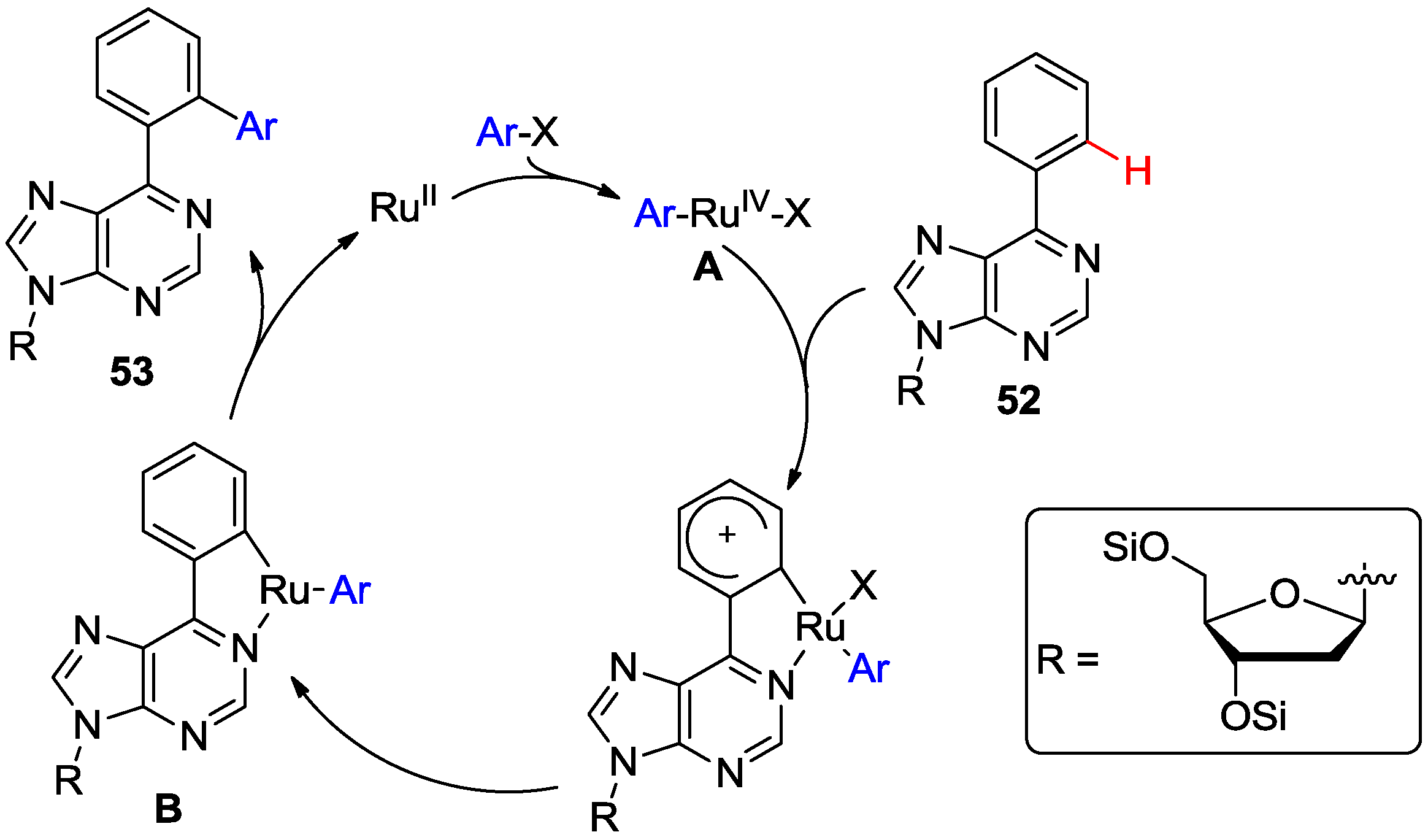 A possible mechanism for this direct ortho-arylation was proposed involving purinyl N1-directed electrophilic attack by the aryl/RuIV complex A on the ortho position of the C6-aryl ring atom of the substrate 52 (Scheme 19) [54]. Subsequent reductive-elimination of the five-membered Ru complex B gave product 53. The 2-amino-6-arylpurine nucleosides were unreactive, indicating that the presence of C2-amino group is critical and often inhibits the reactivity of purine nucleoside towards C-H activation reactions.