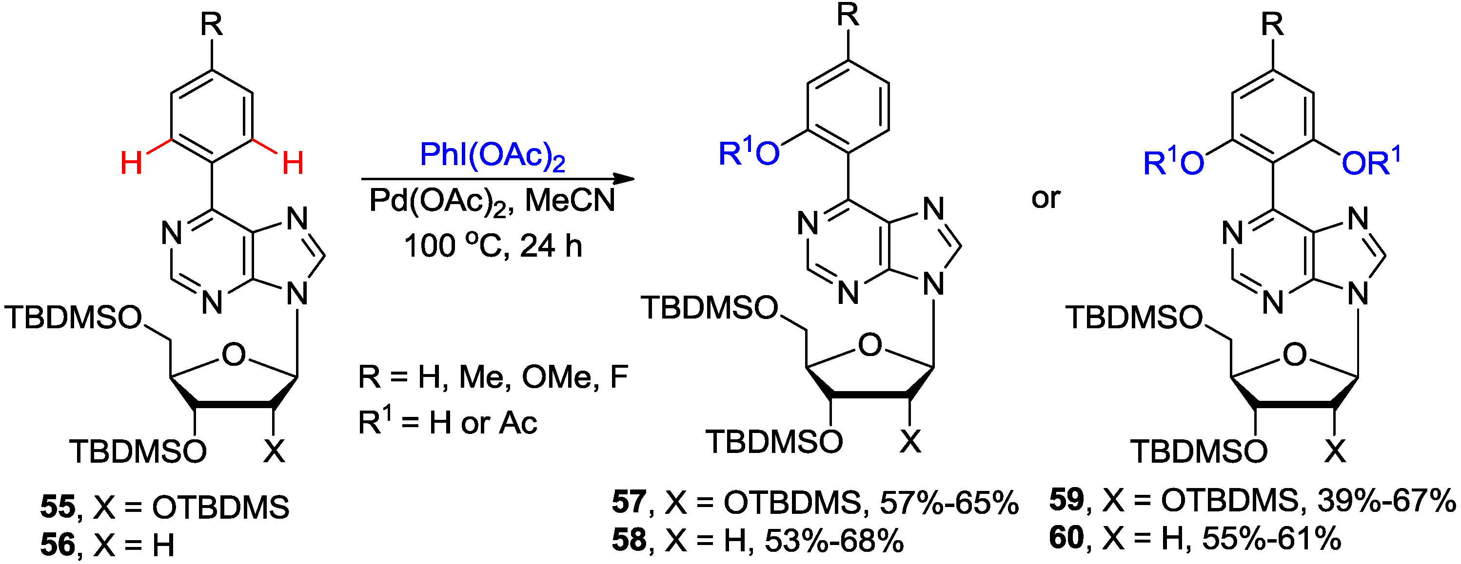 The Pd-catalyzed C-H bond activation and oxidation of the silyl protected C6-aryl ribonucleosides of type 55, as well as the 2'-deoxy counterparts (e.g., 56), in the presence of PhI(OAc)2 as a stoichiometric oxidant in MeCN provided access to monoacetoxylated products 57 or 58 in good yields (Scheme 20) [55]. Increasing the loading of PhI(OAc)2 to 3 equiv gave mainly the diacetoxylated products 59 or 60. The involvement of the N1-purinyl atom in this N-directed C-H bond activation was demonstrated by isolation and crystallographic characterization of the dimeric PdII-containing cyclopalladated C6 naphthylpurine derivative. The latter complex, together with PhI(OAc)2, was shown to be effective in catalyzing oxidation of substrate 56 to 58.