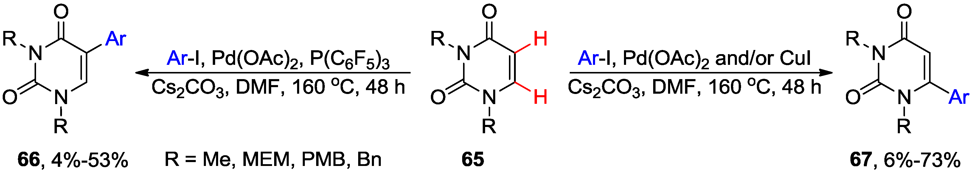 Direct C-H arylation of the pyrimidine nucleosides is currently limited to uracil bases. The main challenge which needed to be overcome was a regioselective activation of the C5-H or C6-H bond of the uracil ring. Also lacking are efficient conditions which could be applicable to the natural uridine and 2'-deoxyuridine analogues. Hocek and coworkers reported the regioselective C-H arylations of 1,3-dimethyluracil (65, DMU, R = Me) with aryl halides. Thus, arylation in the presence of Pd(OAc)2 and Cs2CO3 mainly formed the 5-arylated uracil analogues 66, while coupling in the presence of Pd catalyst and CuI (3 equiv.) preferentially formed the 6-arylated derivatives 67 (Scheme 22) [57,58]. Interestingly, Cu-mediated arylation in the absence of Pd catalyst gave exclusively 6-aryluracils 67 albeit in lower yields. These couplings required high temperature (160 °C) and long time (48 h) and were not applicable to the synthesis of unsubstituted uracils. Also the electron-deficient aryl bromides were poor substrates. In order to prepare the unprotected uracil derivatives, these protocols were also applied to N-benzyl protected uracil derivatives. Subsequent debenzylation (e.g., 67, R = Bn) afforded efficiently 5- or 6-aryled uracil derivatives [57,58]. The experimental results indicated that different mechanisms are involved in these diverse arylation reactions [57,58].