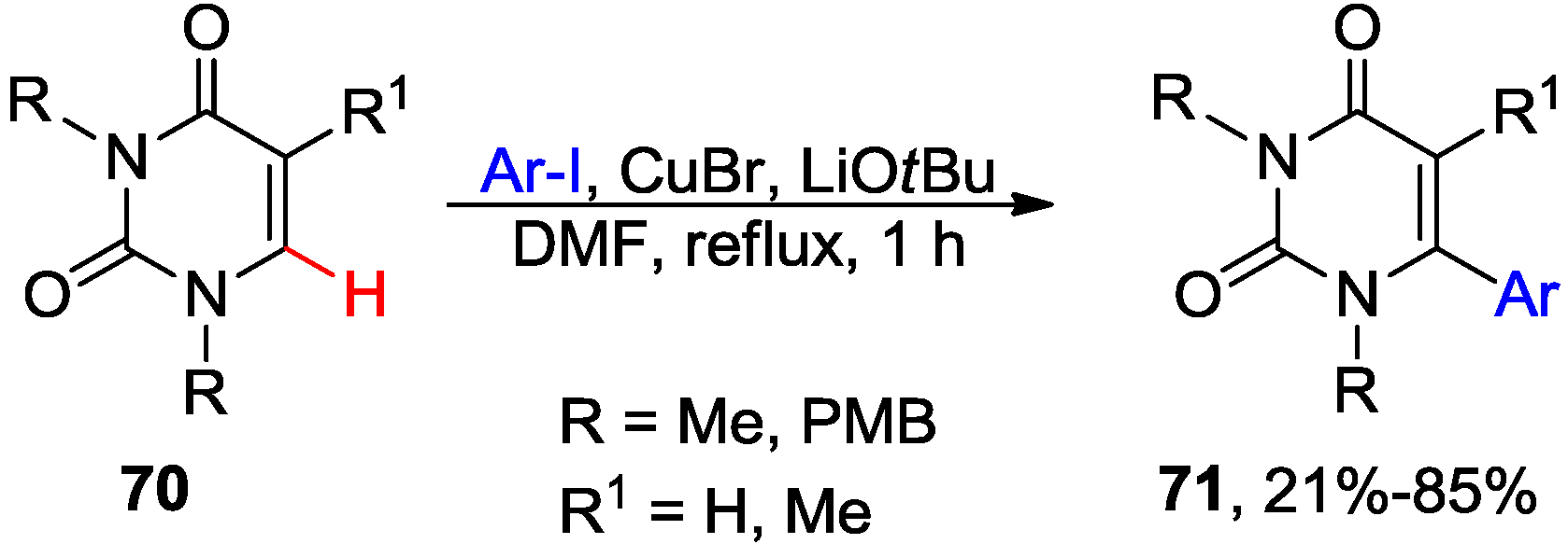 - Cheng, C.; Shih, Y.C.; Chen, H.T.; Chien, T.C. Regioselective arylation of uracil and 4-pyridone derivatives via copper(I) bromide mediated C–H bond activation. Tetrahedron 2013, 69, 1387–1396. [Google Scholar] [CrossRef]