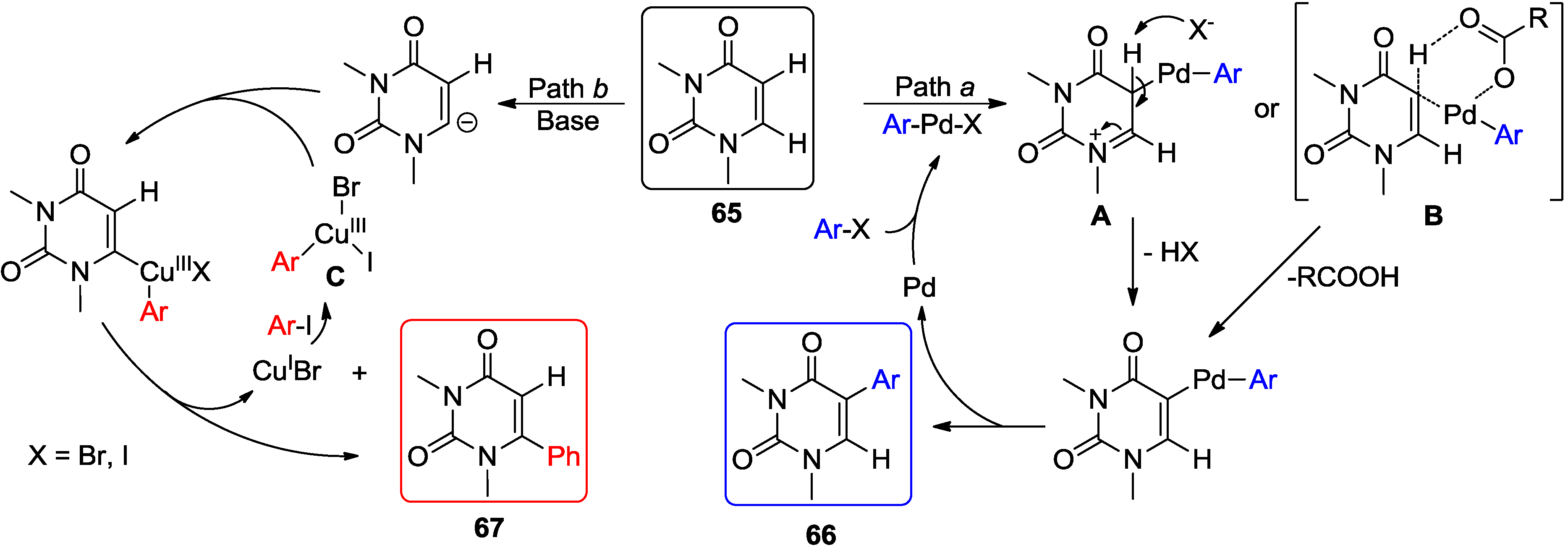 The fact that 3-N-methyl-5-iodouracil substrates, which lack the ability to tautomerize to the enol form, did not undergo these couplings with arenes indicates that the C4-alkoxide (enol form of uracil) may participate in the intramolecular processes of hydrogen abstraction as depicted in Figure 3. The mechanism pathway, after the initial oxidative-addition of palladium to C5-halogen bond, might involve electrophilic aromatic palladation assisted by C4-alkoxide (e.g., A) or direct proton abstraction assisted by C4-alkoxide (e.g., B) [80]. This would be in agreement with earlier finding [7,81] that direct arylation is facilitated by a Pd-coordinated carboxylate group, which also can assist in intramolecular proton abstraction.