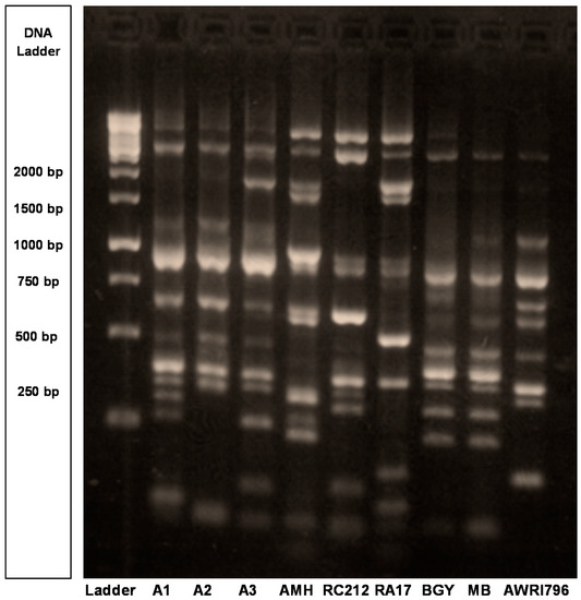 Genetic and phenotypic characterization revealed the genetic uniqueness of the Burgundian isolates (A1, A2, A3) and their compatibility with one another in mixed culture fermentations. PCR-based genetic fingerprinting [18] differentiated the three Bugundian isolates from six industrial (commercial) strains (Figure 1). All strains had unique banding patterns except Enoferm Burgundy (BGY) and Maurivin B (MB) which were identical. Therefore, MB was excluded from further analysis (Figure 1). As such, they were genetically different from one another and would be expected to have different enological characteristics [19].