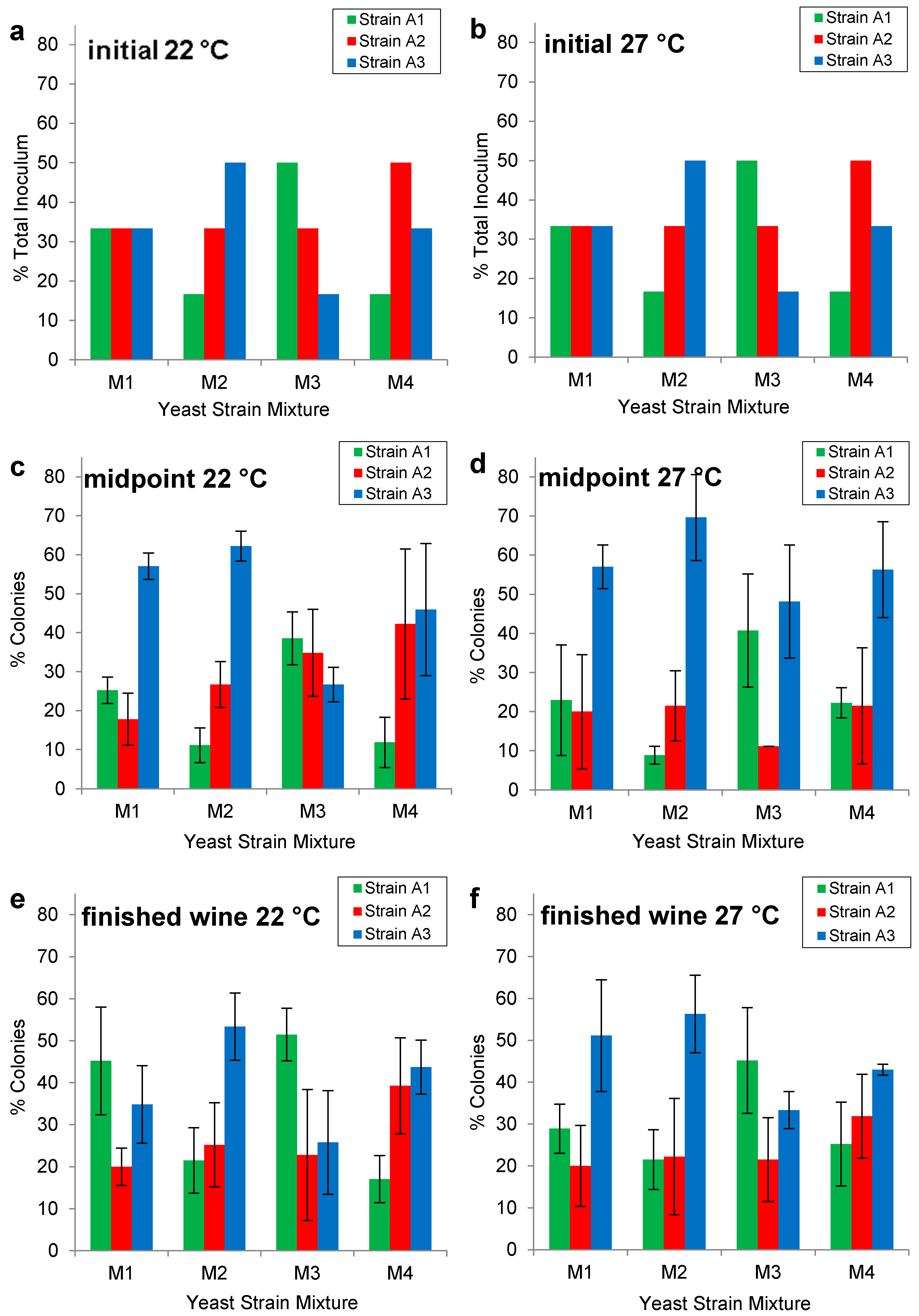 Initial inoculation ratios of Pinot noir fermentations co-cultured with Burgundian isolates (A1, A2, A3) in mixtures M1 (1:1:1), M2 (1:2:3), M3 (3:2:1), and M4 (1:3:2) at (a) 22 °C and (b) at 27 °C. Mixed strain populations at the midpoint (~6.0% v/v ethanol) (c) at 22 °C and (d) 27 °C and end of fermentation (~13.5% v/v ethanol) (e) at 22 °C and (f) at 27 °C. Yeast populations were quantified using colony PCR in conjunction with δ sequence typing on 45 colonies for each of three biological replicates.