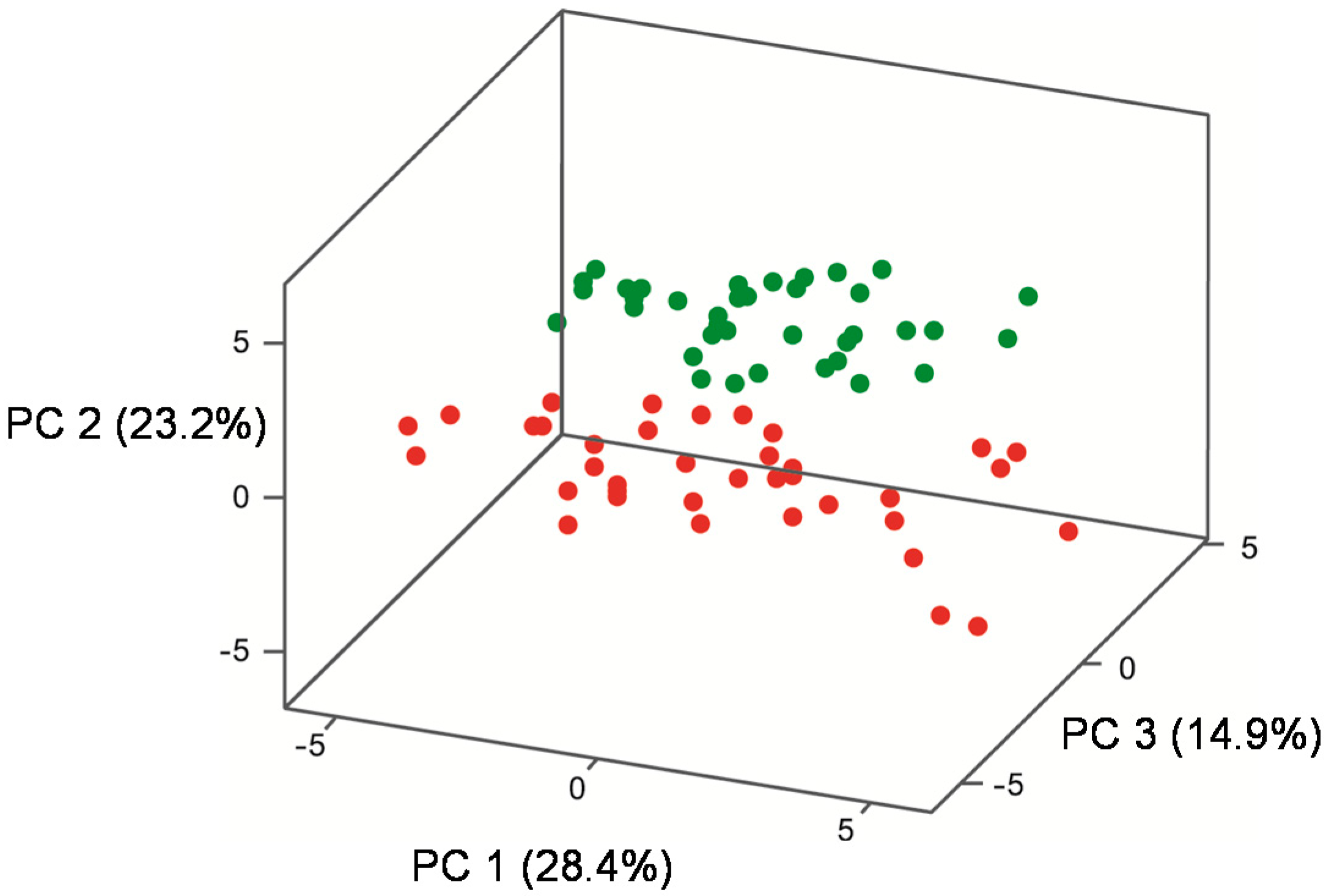 Principal component analysis (PCA) was used to examine the patterns of 25 volatile compounds associated with the wine products from the five industrial strains and three individual- and four mixed-Burgundian isolates, at both fermentation temperatures in triplicate using Minitab 16 (Minitab Inc., State College, PA, USA). Vector coordinates were scaled by a factor of five times to aid in visualization of the data. A principal component (PC) plot was prepared for the first three dimensions (3d-plot) in Minitab 16 (Minitab Inc., State College, PA, USA). Two dimensional figures (2-d plots) of PC 1 versus PC 2, PC 2 versus PC 3 and PC 1 versus PC 3 were prepared in MS Excel (Microsoft, Redmond, WA, USA). Ellipses were drawn on these plots around the industrial strains and mixed-Burgundian isolates as visual aids only.