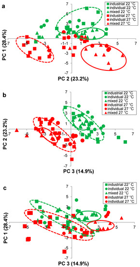Wines were clearly grouped according to their fermentation temperature (22 °C, 27 °C) (Figure 3), but yeast groups were more difficult to discern in a three-dimensional plot. Therefore, two-dimensional plots (Figure 4a–c) were prepared showing PC 1 vs PC 2 (Figure 4a), PC 2 versus PC 3 (Figure 4b) and PC 1 versus PC 3 (Figure 4c).