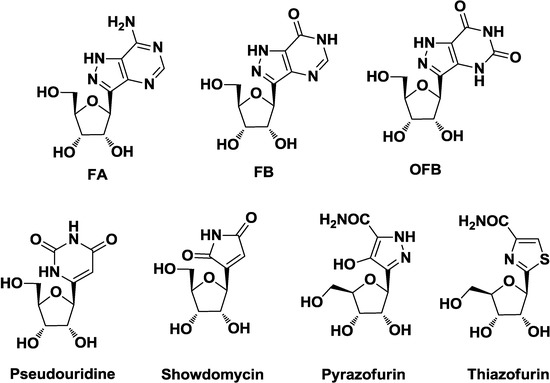 While natural and synthetic N-nucleosides are vulnerable to enzymatic and acid-catalyzed hydrolysis of nucleosidic bond, the C-analogues are much more stable. Many natural and synthetic C-nucleosides, also containing modified heterocyclic bases, biologically active, have been described in literature. Natural antibiotics formycins [11] (in particular FA, FB, and oxoformycin B OFB) have been known since the early 1960s to possess antibiotic and cytotoxic properties; their antiparasitic activity (antimalarial, antischisostoma, etc.) was unraveled later. Pseudouridine is the most abundant natural C-nucleoside present in most tRNA and rRNA structures [12], where it has been shown to stabilize RNA duplex [13,14]. Showdomycin [15] possesses well known antibiotic and cytotoxic properties, involving inhibition of nucleoside transport into the cell [16]. Pyrazofurin [17] and tiazofurin [18] have been shown to possess a wide range of medicinal properties, including antibiotic, antiviral, and antitumor activity (Figure 1).