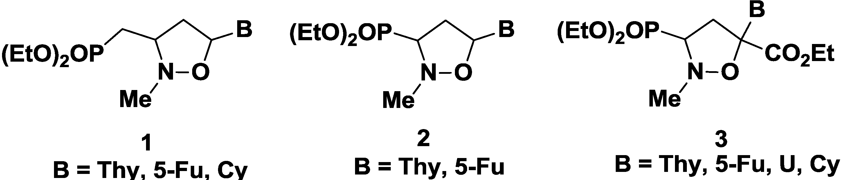 As part of ongoing efforts to identify new antiviral/antitumor agents, we were interested in the investigation of N,O-nucleosides, where the ribose moiety has been replaced by an isoxazolidine system, as mimetic of the sugar unit [19,20,21,22,23]. Phosphonated carbocyclic 2'-oxa-3'-azanucleosides 1 have shown to be potent inhibitors of RT of different retroviruses, following incubation with human PBMCs crude extract [24,25,26]; truncated phosphonated azanucleosides 2 are able to inhibit HIV and HTLV-1 viruses at concentration in the nanomolar range [27]; truncated phosphonated N,O-psiconucleosides 3 inhibit HIV in vitro infection with low or absent cytotoxicity (Figure 2) [28].