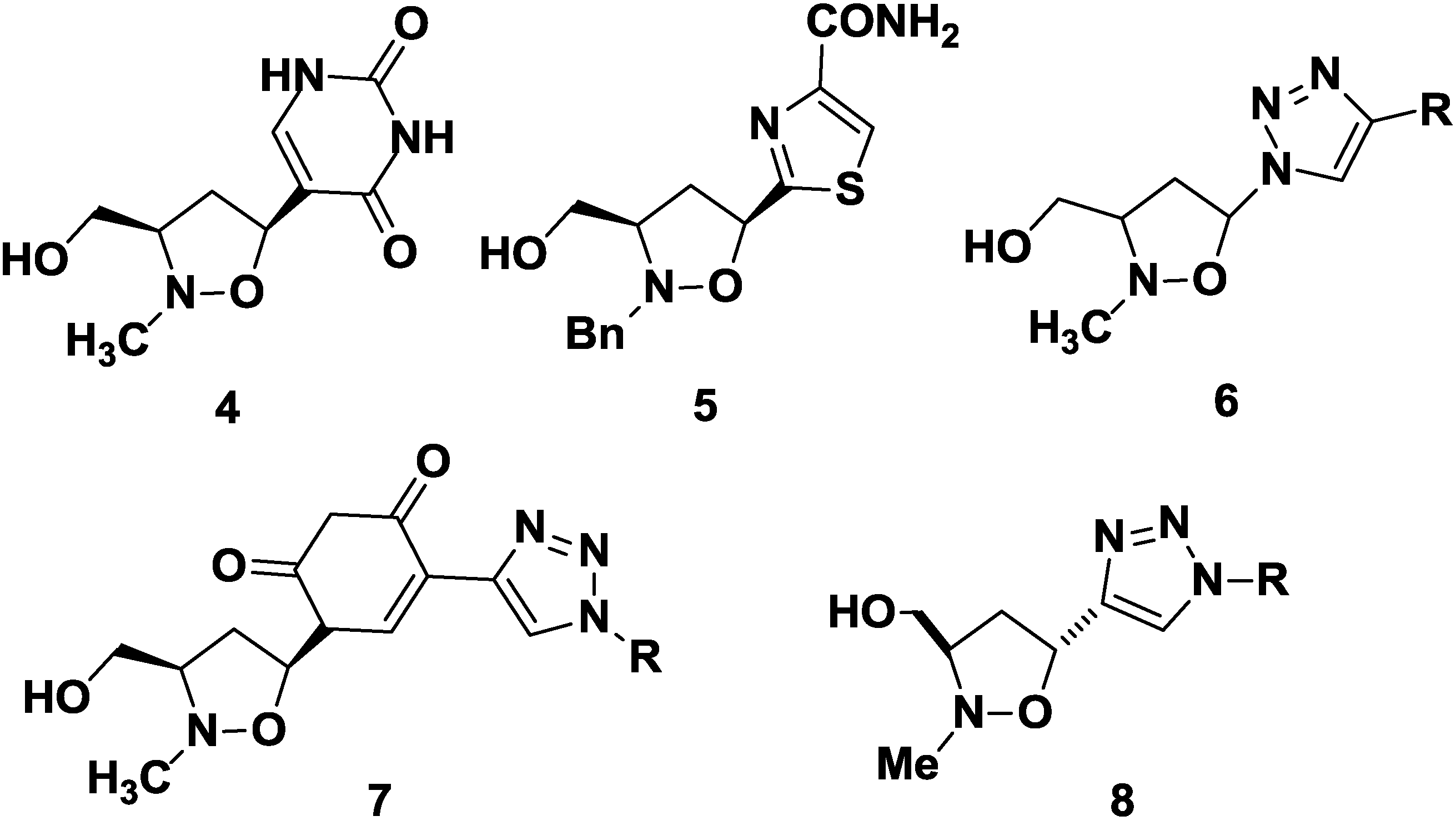 New base-modified N,O-nucleosides have been also synthesized. N,O-pseudouridine 4 [29] and N,O-tiazofurin 5 [30] are characterized by a C-C bond between the isoxazolidine and the heterocyclic systems.