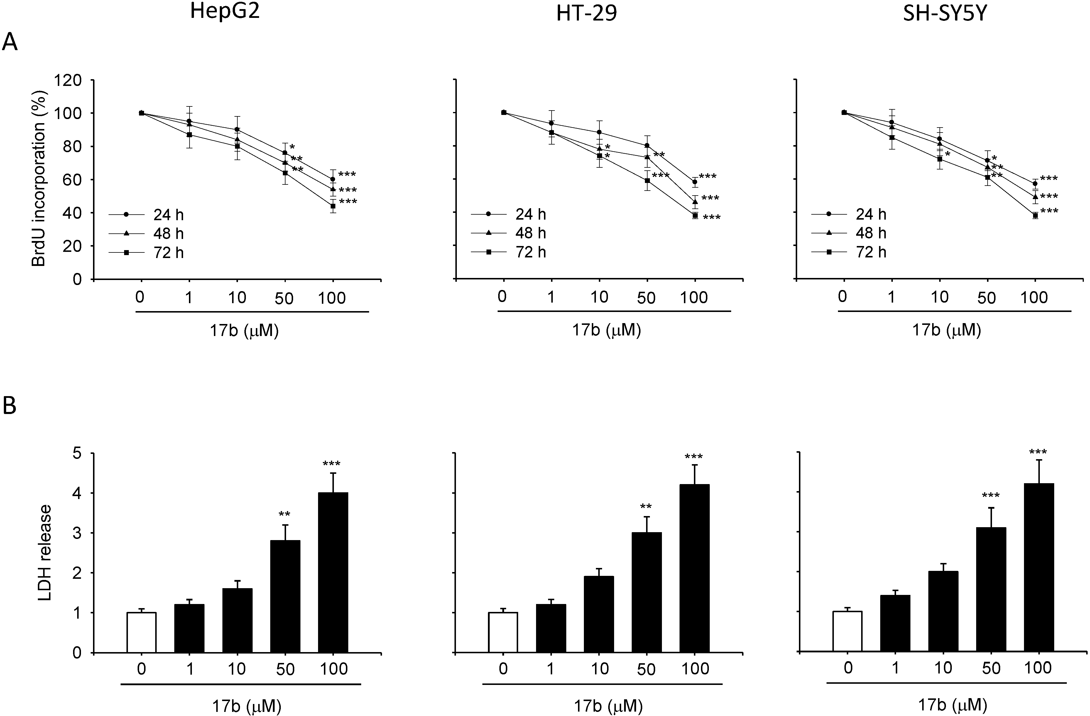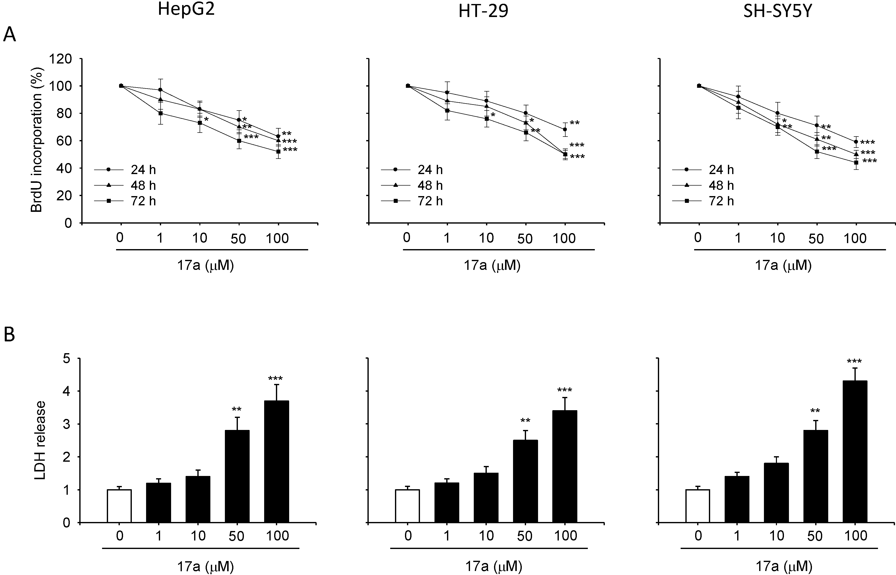 Compound 17a reduces cell proliferation and induce LDH release. HepG2, HT-29 and SH-SY5Y cells were exposed to increased concentration of 17a compound for 24, 48 and 72 h. (A) Proliferation rate assessed by BrdU assay. (B) Cytotoxic effect assessed in terms of LDH release after 24 h of exposure. Each value is the mean ± S.E.M. of three experiments performed eight times (BrdU) or in triplicate (LDH) and repeated three different times. * p < 0.05 vs. ctrl, ** p < 0.01 vs. ctrl, *** p < 0.001 vs. ctrl.