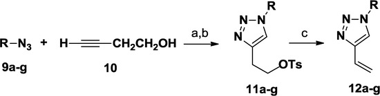 C-Vinyl triazoles 12a–g have been prepared according to Scheme 1 [33]. Thus, 3-butyn-1-ol 10 was reacted with a variety of azides 9a–g, by click chemistry reactions, performed in H2O/tert-BuOH (1:1) in the presence of sodium ascorbate, copper(II) sulfate and TEA at room temperature. The obtained triazole derivatives have been tosylated and then converted into vinyl triazoles 12a–g by reaction with potassium tert-butoxide in tert-butanol (78%–90% yields).