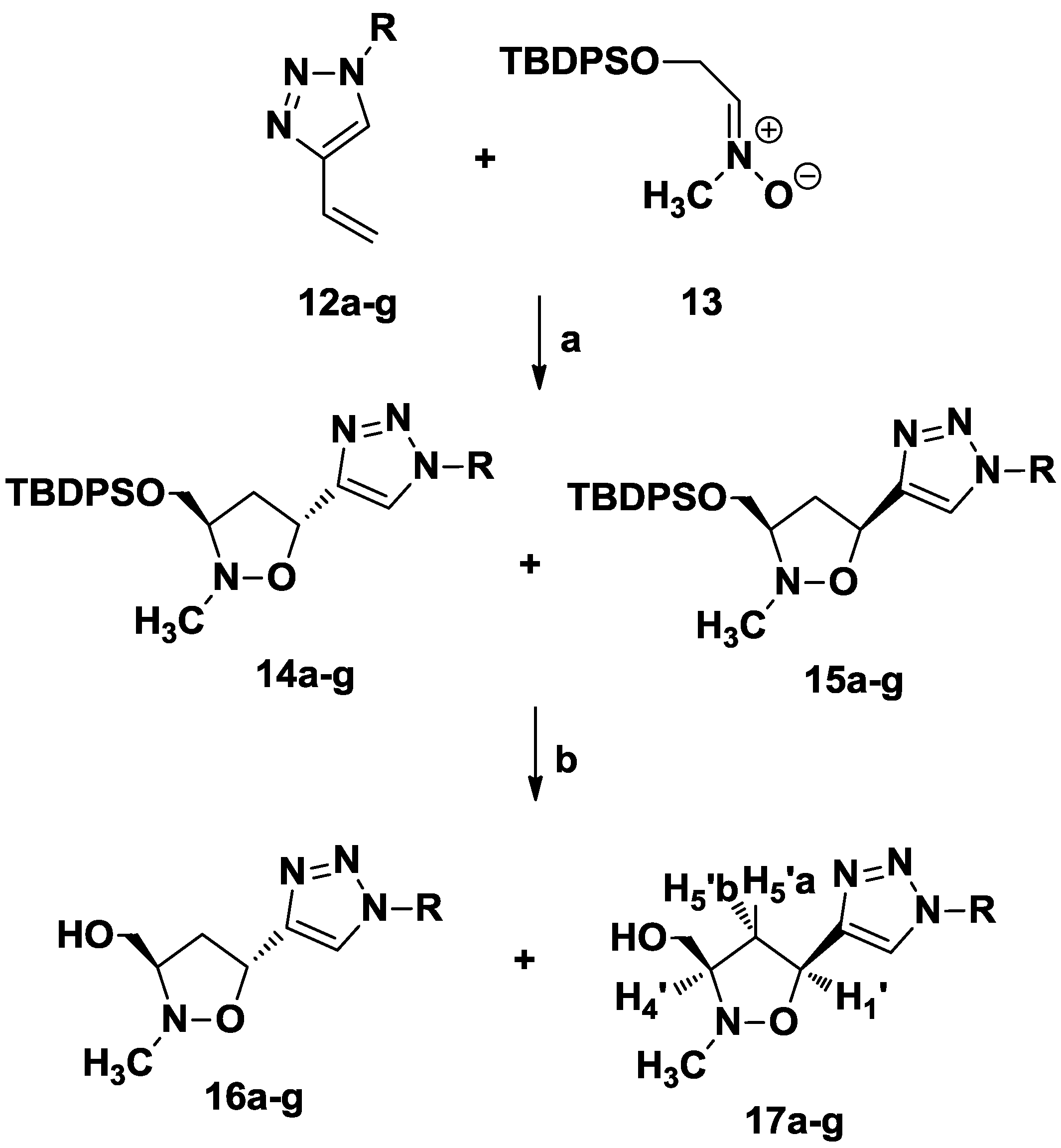 Synthesis of isoxazolidinyl-triazoles 16a–g and 17a–g by 1,3-dipolar cycloaddition.