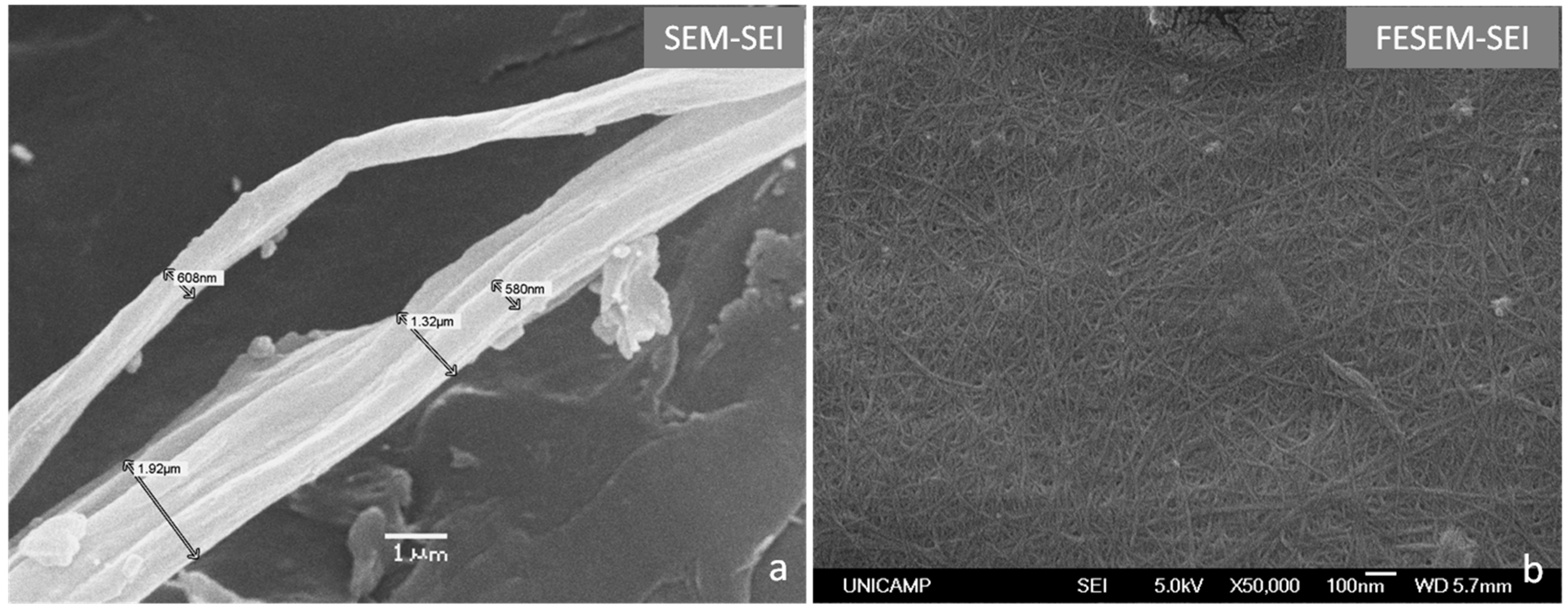 - Campos, A.; Correa, A.C.; Cannella, D.; Teixeira, E.M.; Marconcini, J.M.; Dufresne, A.; Mattoso, L.C.; Cassland, C.; Sanadi, A. Obtaining nanofibers from curauá and sugarcane bagasse fibers using enzymatic hydrolysis followed by sonication. Cellulose 2013, 20, 1491–1500. [Google Scholar] [CrossRef]