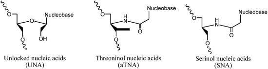 - Murayama, K.; Tanaka, Y.; Toda, T.; Kashida, H.; Asanuma, H. Highly stable duplex formation by artificial nucleic acids acyclic threoninol nucleic acid (aTNA) and serinol nucleic acid (SNA) with acyclic scaffolds. Chemistry 2013, 19, 14151–14158. [Google Scholar] [CrossRef] [PubMed]