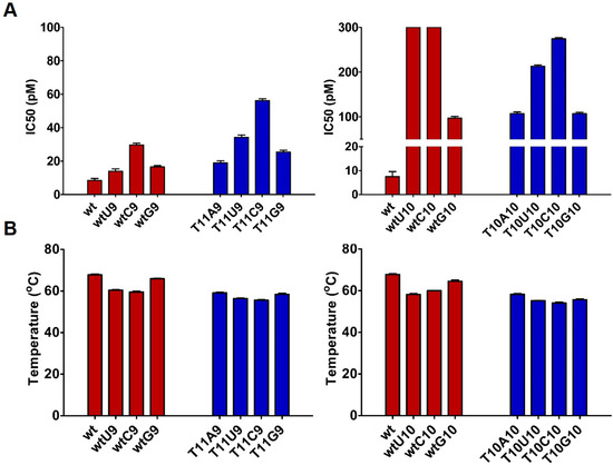 | T10G10 | ..U.. | ..A.. | 110 ± 0.9 | 55.7 ± 0.3 | 10.8 | 1.3 |