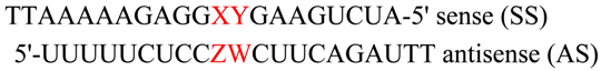 | Antisense ..ZW.. | Sense ..XY.. | IC50 (pM) ± SD | Tm (°C) ± SD | ΔTm (wt) | ΔTm (Parent) | |