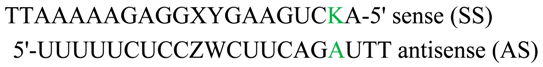 - Du, Q.; Thonberg, H.; Wang, J.; Wahlestedt, C.; Liang, Z. A systematic analysis of the silencing effects of an active siRNA at all single-nucleotide mismatched target sites. Nucleic Acids Res. 2005, 33, 1671–1677. [Google Scholar] [CrossRef] [PubMed]