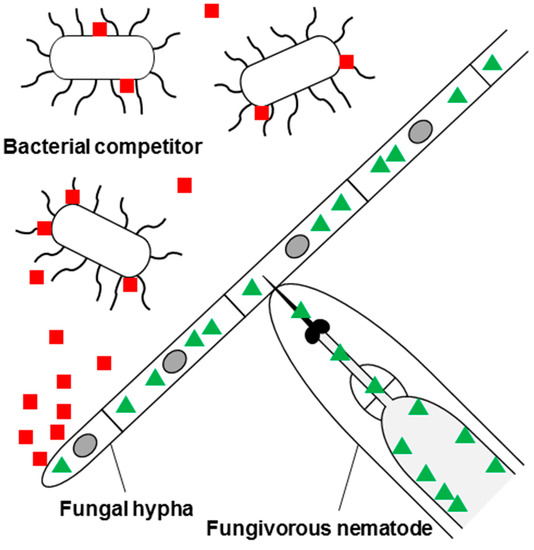 Depending on their ecological niche and their preferred substrate, fungi are exposed to a variety of antagonists. Due to its high surface to volume ratio, the vegetative mycelium of a fungus is very susceptible to other microorganisms that compete for the same nutrients and may even feed on the degradation products released by the action of the hydrolytic enzymes secreted by the fungus. Very nutrient-rich substrates, such as the dung of herbivores, are usually colonized by a plethora of competing microorganisms [2]. The lack of motility and the high nutrient content, on the other hand, makes both the fungal vegetative mycelium and the fruiting bodies very attractive food sources for animal predators. Accordingly, soil inhabiting fungi have been shown to be an important food source for soil arthropods and nematodes [3].