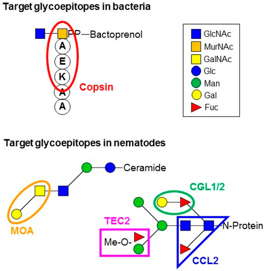 - Yan, S.; Bleuler-Martinez, S.; Plaza Gutierrez, D.F.; Kuenzler, M.; Aebi, M.; Joachim, A.; Razzazi-Fazeli, E.; Jantsch, V.; Geyer, R.; Wilson, I.B.; et al. Galactosylated fucose epitopes in nematodes: Increased expression in a Caenorhabditis mutant associated with altered lectin sensitivity and occurrence in parasitic species. J. Biol. Chem. 2012, 287, 28276–28290. [Google Scholar] [CrossRef] [PubMed]