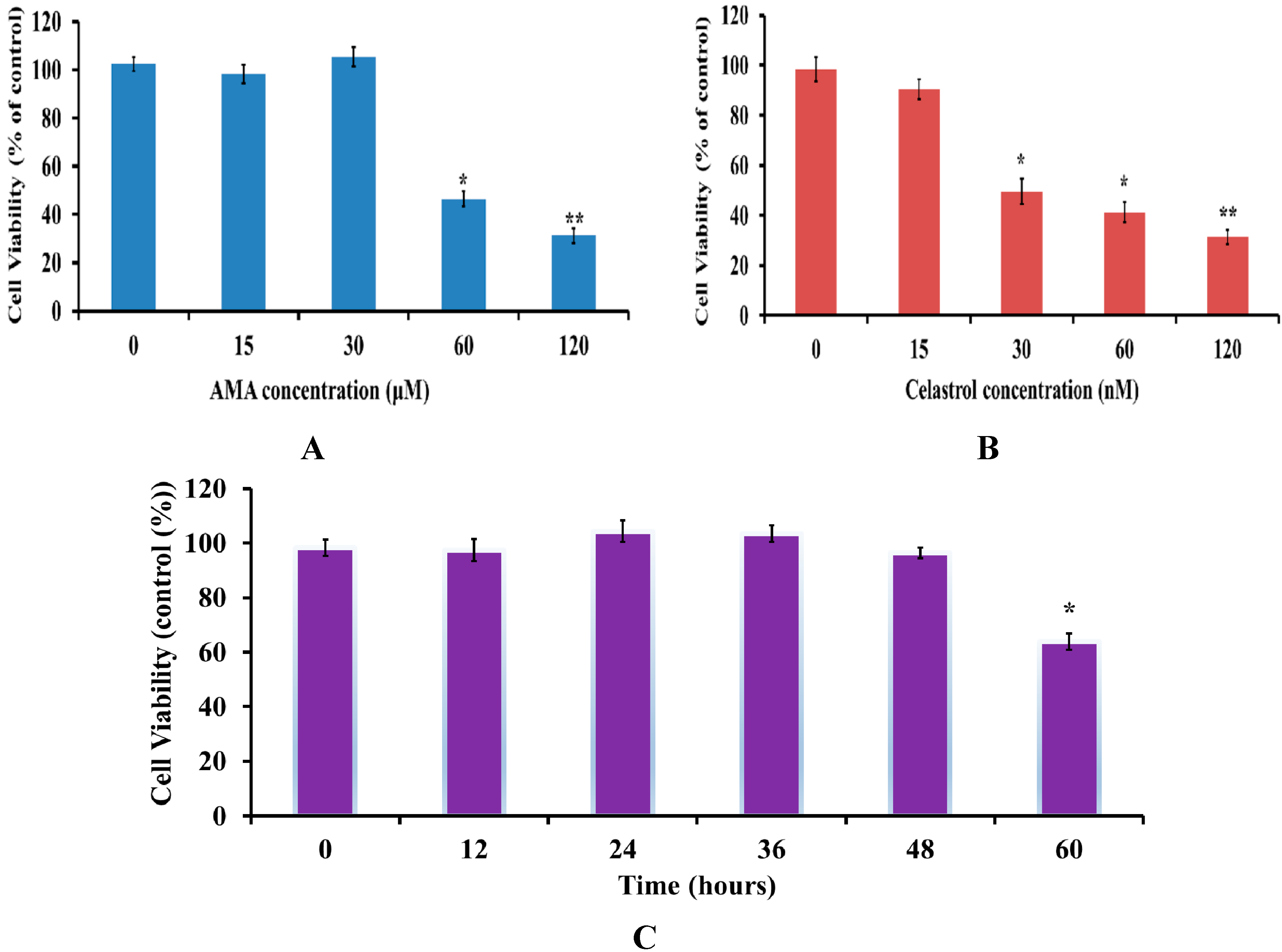 2.1. Effects of AMA and Celastrol Treatment on Cell Viability (Dose and Time-Dependent)