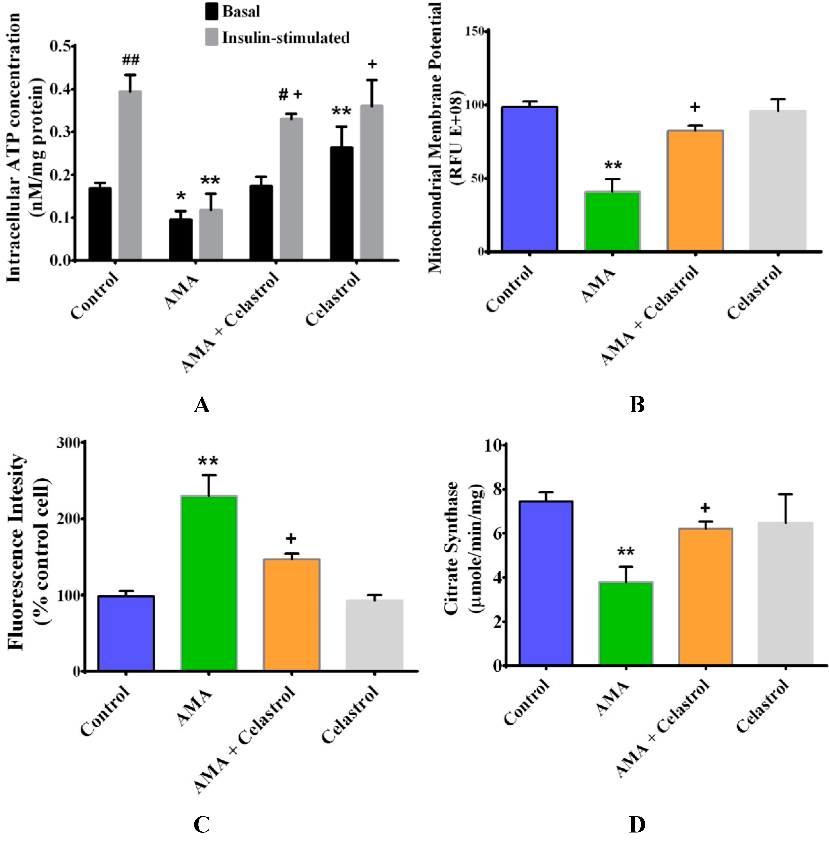 2.3. Celastrol Improves Mitochondrial Activity and Energy Production in AMA-Induced Insulin-Resistant Human Skeletal Muscle Cells
