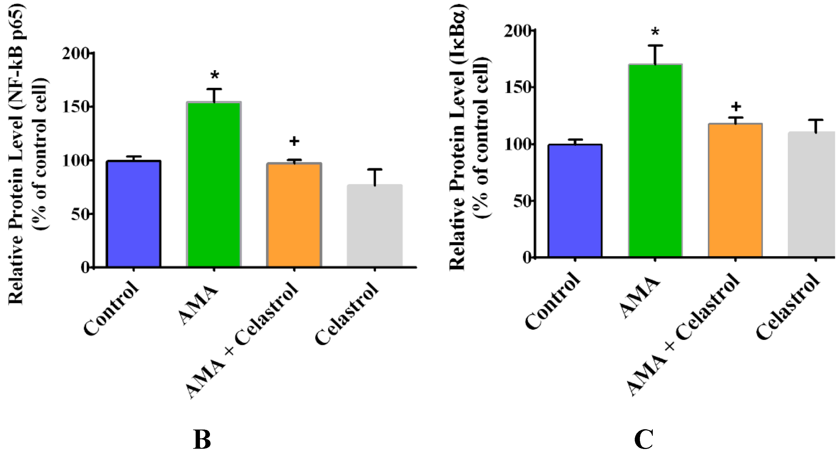 2.7. Effect of AMA and Celastrol on NF-κB and IκBα Expression Protein Activity