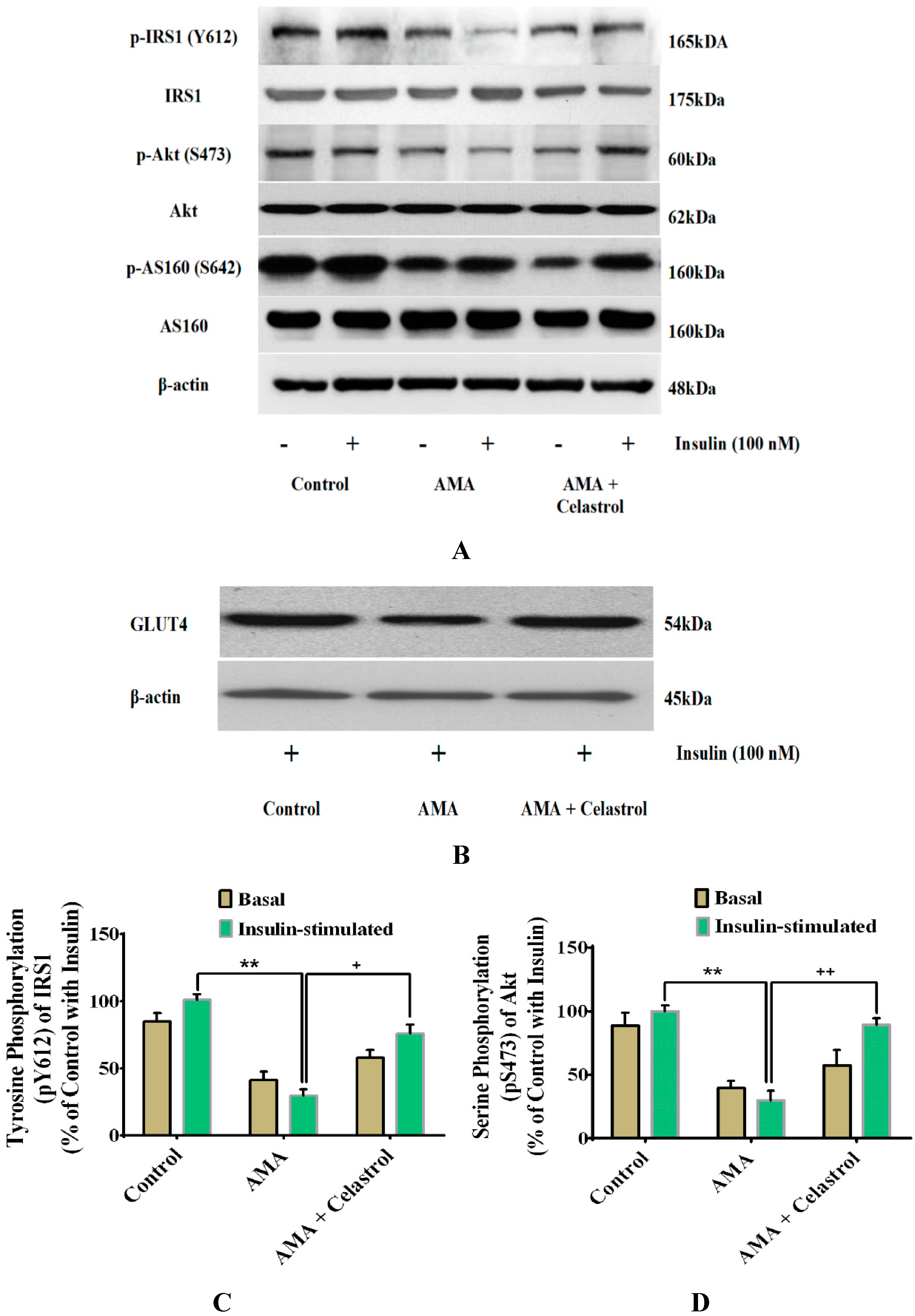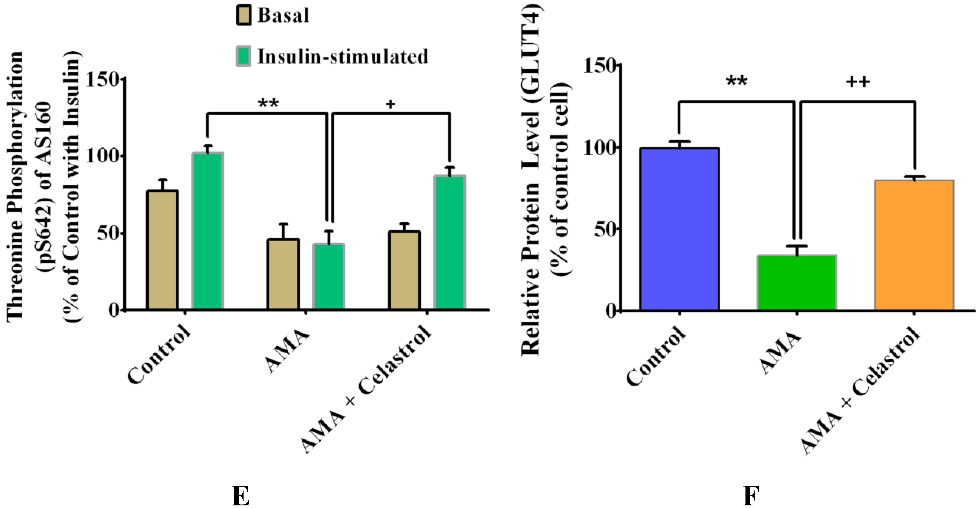 2.8. Effects of Celastrol on Protein Expression of Insulin Signaling Pathways and GLUT4 in AMA-Treated Human Skeletal Muscle Cells