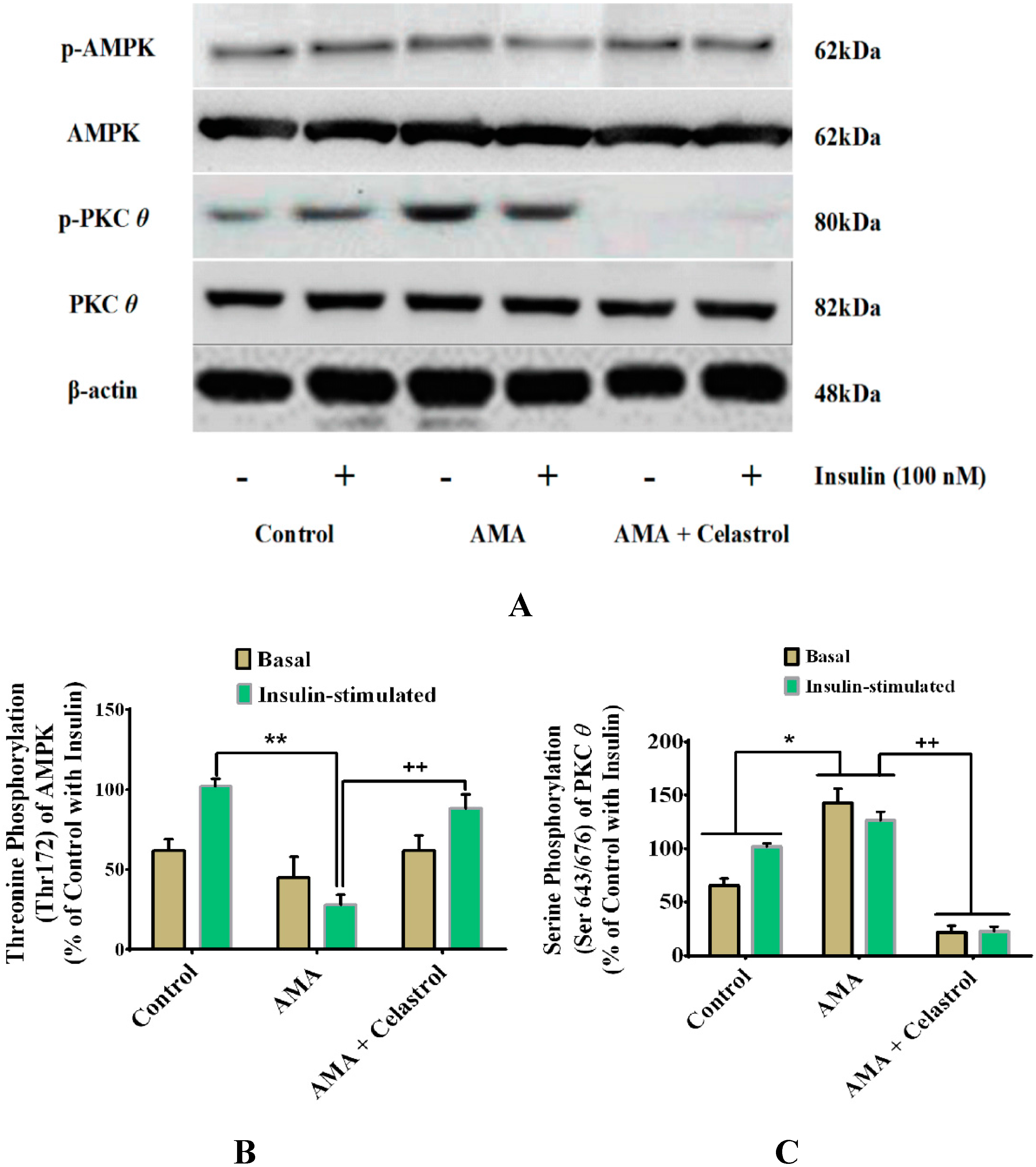 2.9. Celastrol-Regulated pAMPK Expression and Inhibition of PKC θ in AMA-Treated Skeletal Muscle Cells