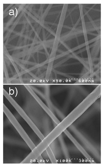 Other solvents for the ES process of cellulose can be found in several patent documents, but most of them describe solvents which are frequently used in the production of regenerated cellulose fiber. In several cases, the processes require pre- or post-ES spinning treatments. The dES of cellulose using perfluoro-organic acids [44] typically yields very fine fibers with the smallest diameter of 60–75 nm without any pre- or post-spinning treatment (Figure 1).