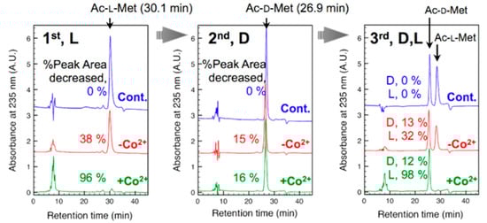 Chirality-specific hydrolysis of Ac-l-Met by aminoacylase-I-immobilized HPC-ESNWs. More details for experiments are described in reference [45]. Left, most all of Ac-L-Met fed were hydrolyzed; Middle, No hydrolysis was observed for Ac-d-Met except for decreases in peak area due to absorption; Right, Only Ac-l-Met was hydrolyzed in a racemic mixture. Co2+ is a cofactor for enhancing the enzymatic activity.