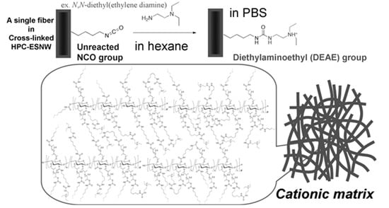 Ohkawa et al., described the conjugation of ligands via an electrostatic interaction between hydroxypropyl cellulose (HPC)-ESNWs. The surfaces of the fine fibers in the HPC-ESNW matrices are chemically modified using diasocyanate cross-linkers (Figure 2) [45]. The excess amount of the cross-linkers in the treatments plays two roles; one is just for cross-linking, which renders the HPC-ESNWs insoluble in most solvents, and the other one is for leaving unreacted NCO groups, which can be utilized both as: (a) a direct acceptor of any substance molecules having nucleophilic moieties, and (b) if N,N-diethylethylene diamine is used for the linkage via (a), strongly cationic (diethylaminoethyl—DEAE) groups can be introduced on the surfaces of the HPC fine fibers. These ideas have been derived from the method to prepare the DEAE-cellulose for immobilizing enzymes based on the original studied by Chibata et al. [46].